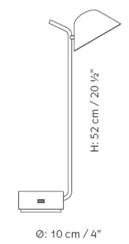 The shape and silhouette of the Peek table lamp is the same as a floor lamp, only the proportions have shrunk. Use the lamp as a reading light, as your new best friend on your desk or as the last thing you see before you close your eyes at night. The base has a concave top creating a bowl for essential stationery, earplugs, jewelry or other small items and the tip of the stem functions as a dimmer.