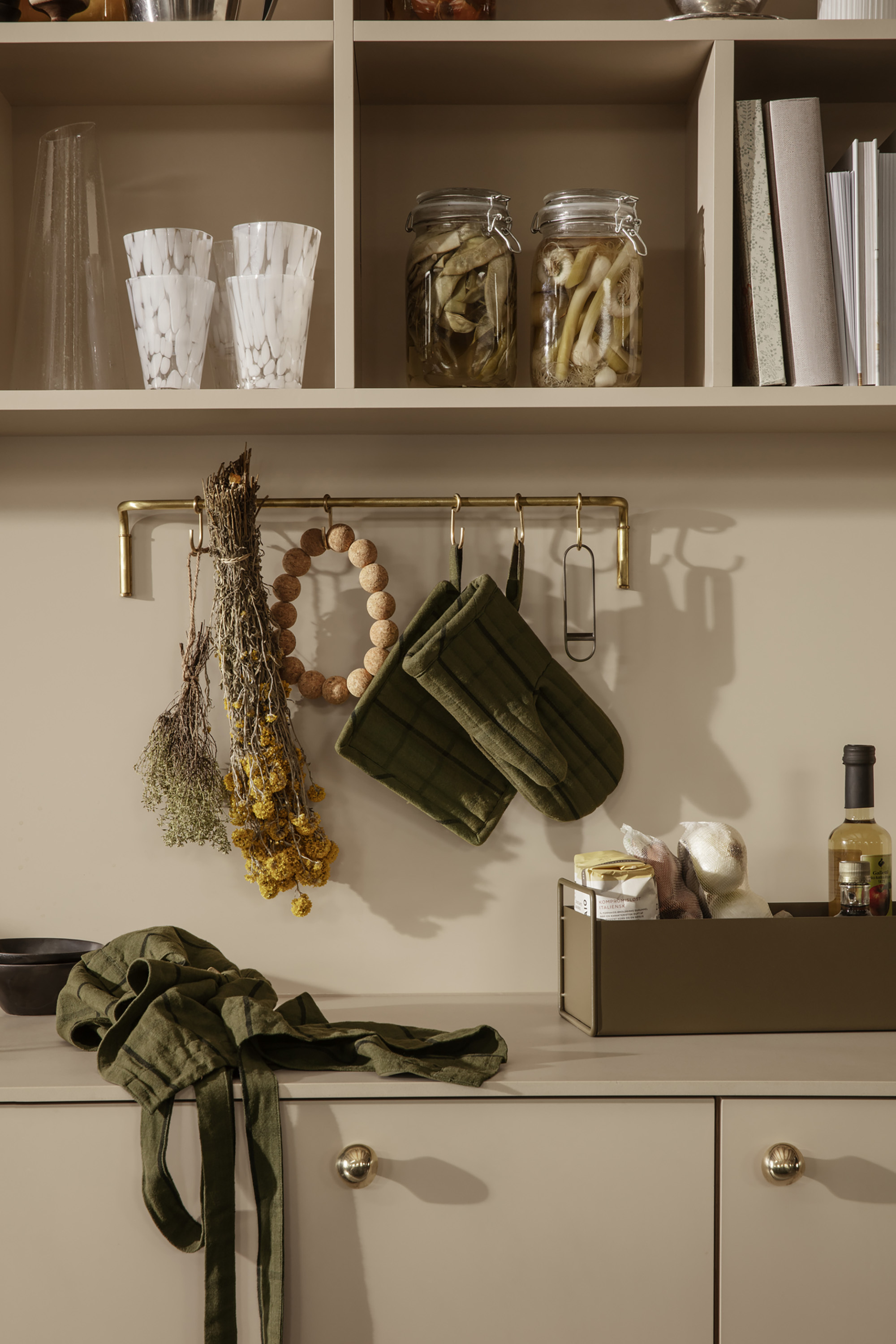ferm LIVING Kitchen Rod 「廚房」掛架,簡單優雅的造型搭配 J 型掛勾,收納輕鬆、拿取方便 ; 大受好評的 Curvature Paper Towel Holder 「曲度」廚房紙巾架,讓紙巾擁有最佳的擺放位置,流動的線條美感,為整體空間注入不同風貌的藝術氛圍。