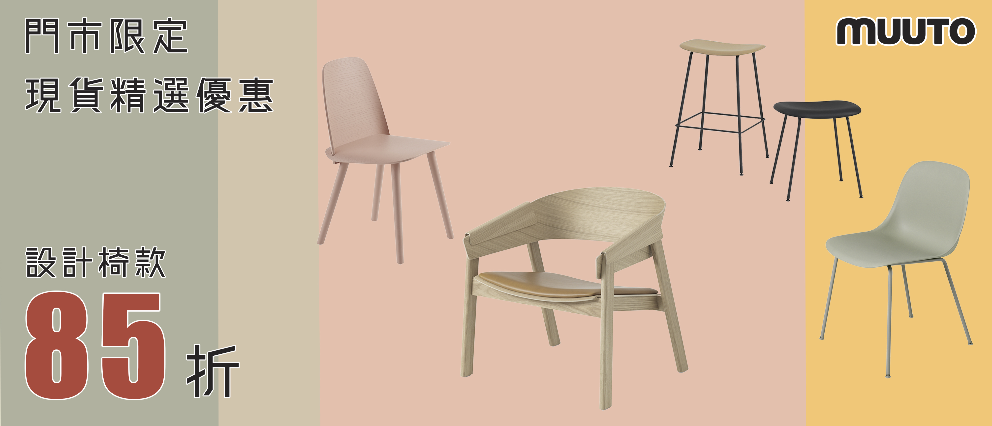 即日起至 9 / 12 日止,凡於 Design Butik 門市購買 Muuto 現貨椅款系列,全面享 85 折優惠!