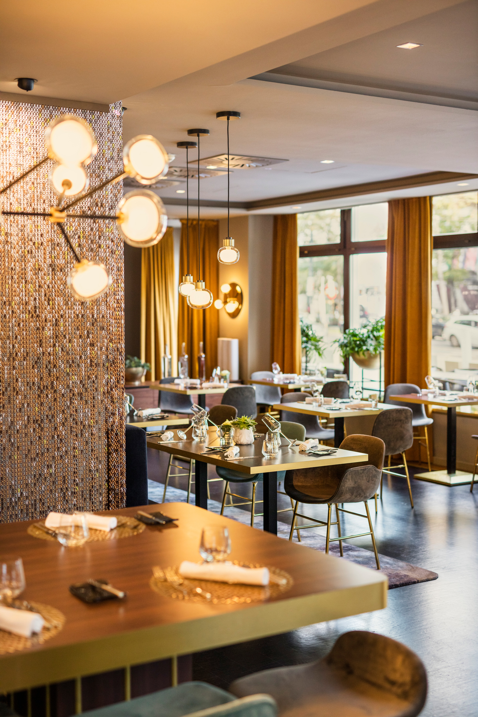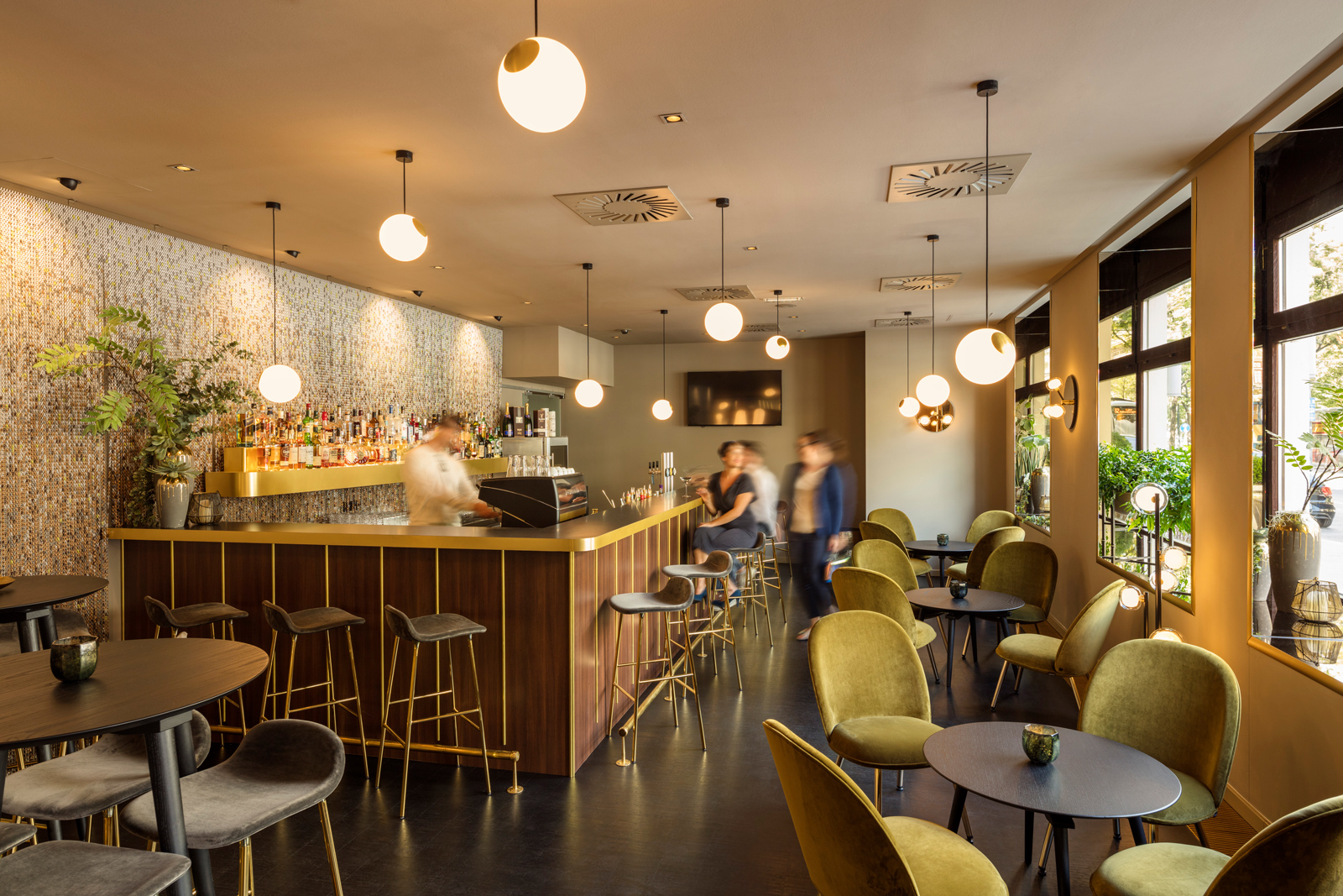 黃銅的椅腳、天鵝絨面的椅面,因著簡潔線條而顯得年輕新穎;大面窗所帶來的自然採光,讓整體空間更加清爽明亮。