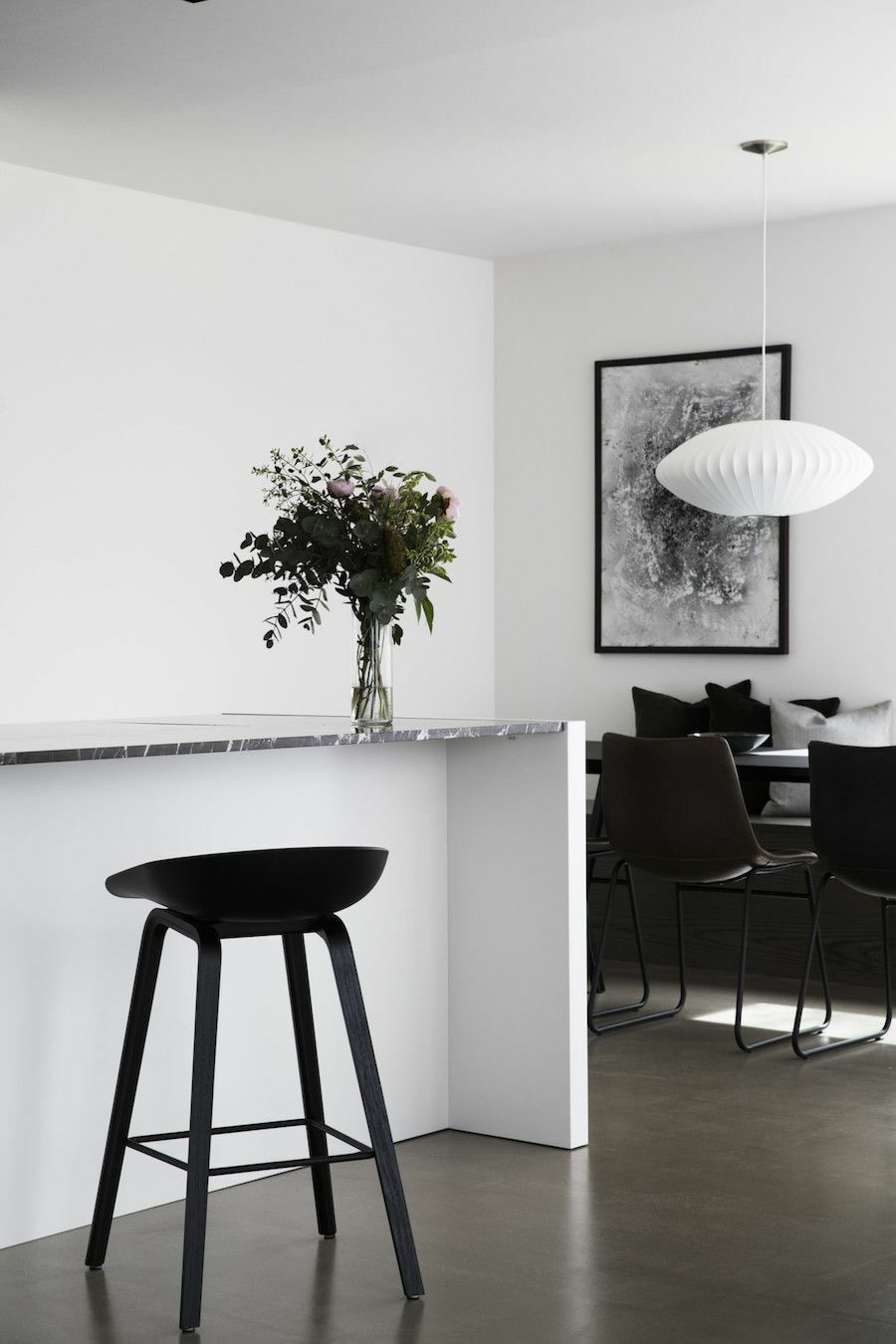 避免整體過於單調無趣,可以選擇深色玻璃材質的家飾、有黑色圖案的海報、或是有明顯弧度的單品。擁有強烈對比又不失完美平衡,帶來富有層次的視覺效果。