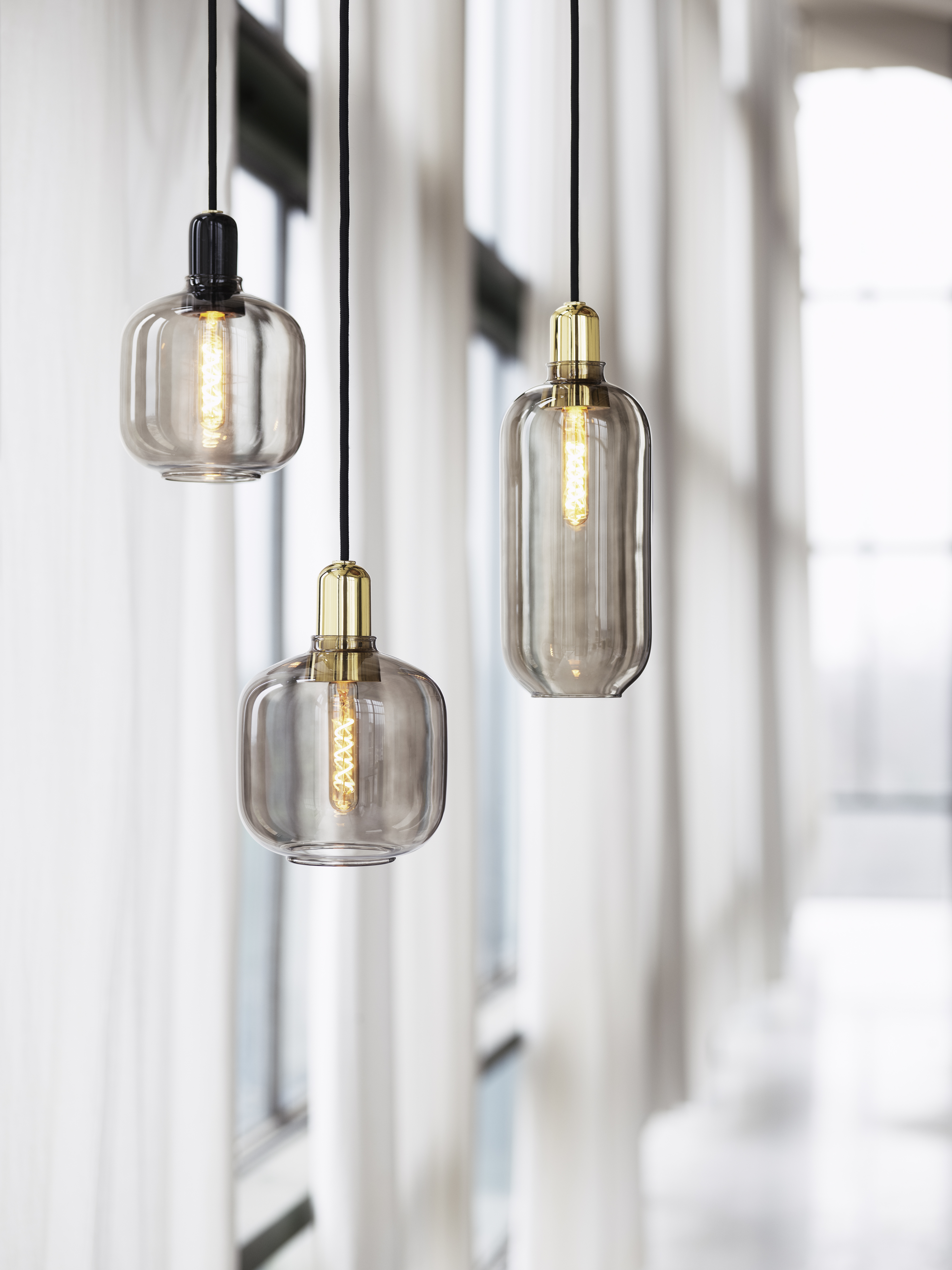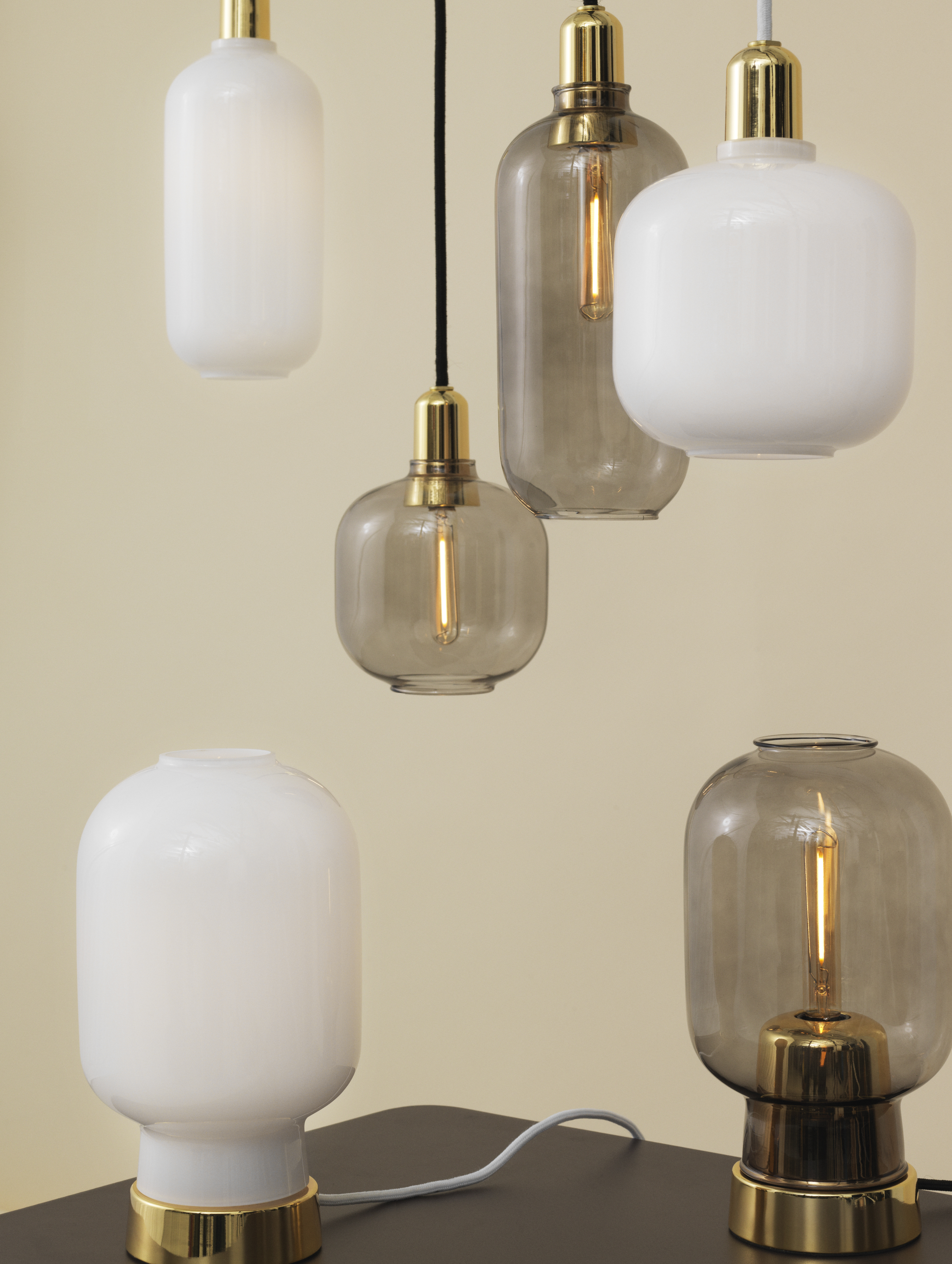 丹麥設計師 Simon Legald 設計的 Amp 燈飾系列,包括一個桌燈以及兩盞吊燈。高質感的玻璃燈罩與黃銅燈頭,結合出一種既輕巧卻又沉甸甸的視覺反差,讓 Amp 兼具懷舊與當代的韻味。