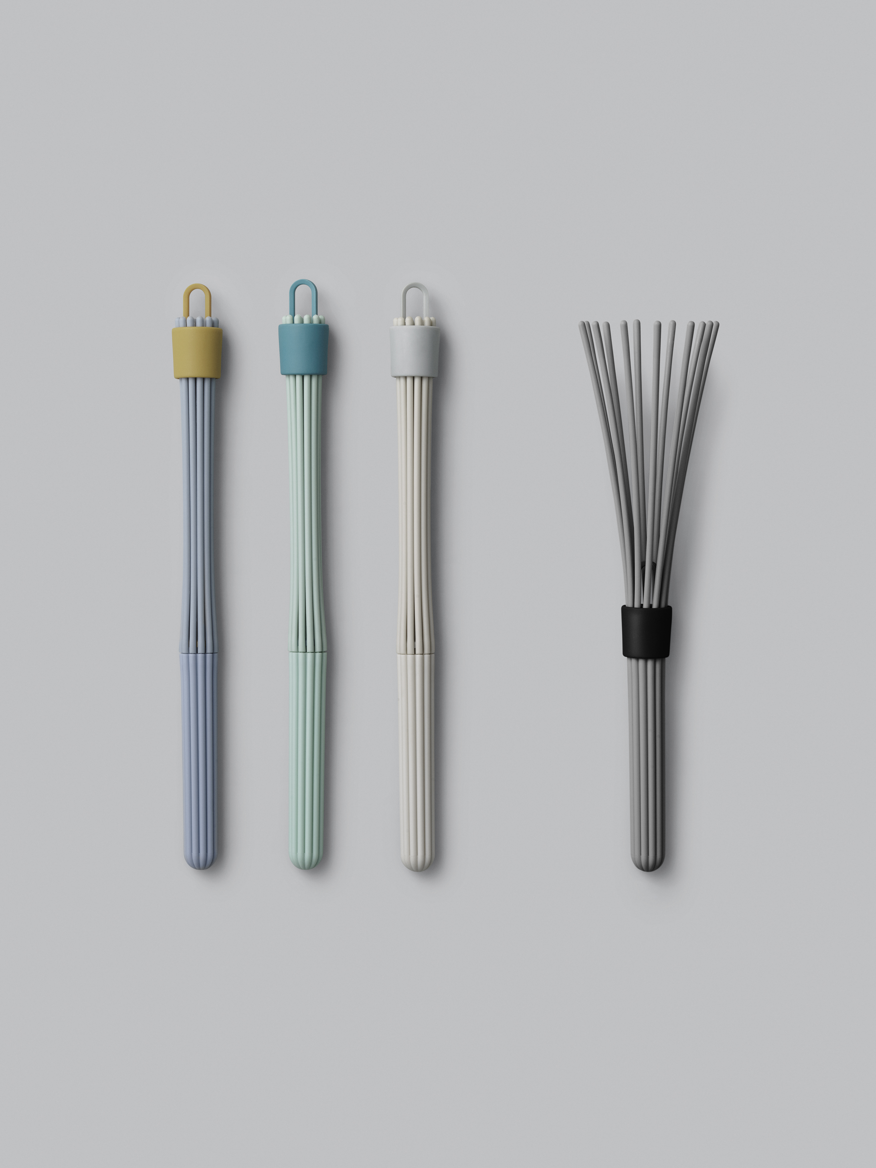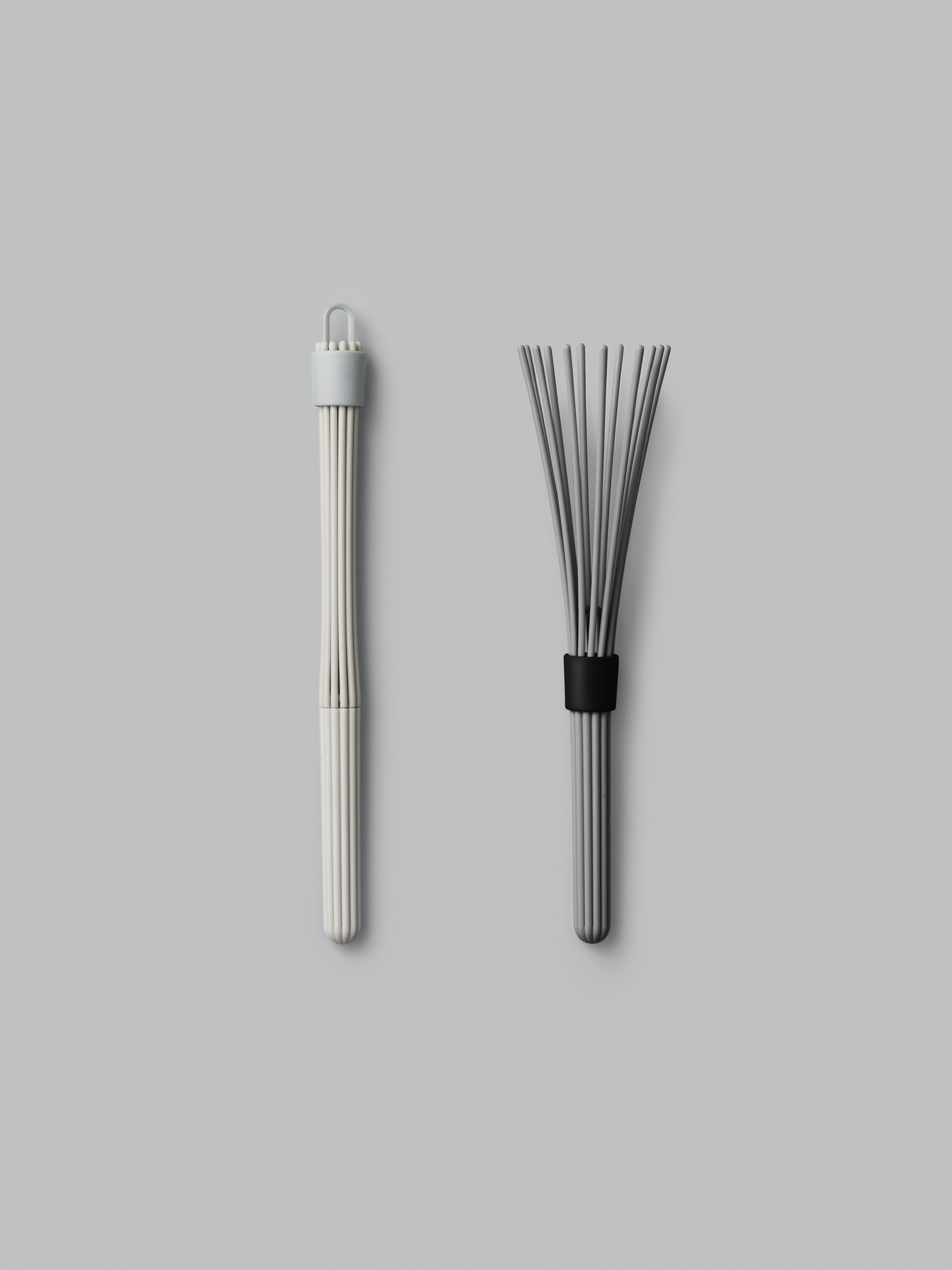 Beater 的靈感來自於綑綁成一束的稻草,利用中間的環狀結構,即可開啟或闔起 Beater。拉環上方還有貼心的掛勾設計,讓廚具收納更為便利。