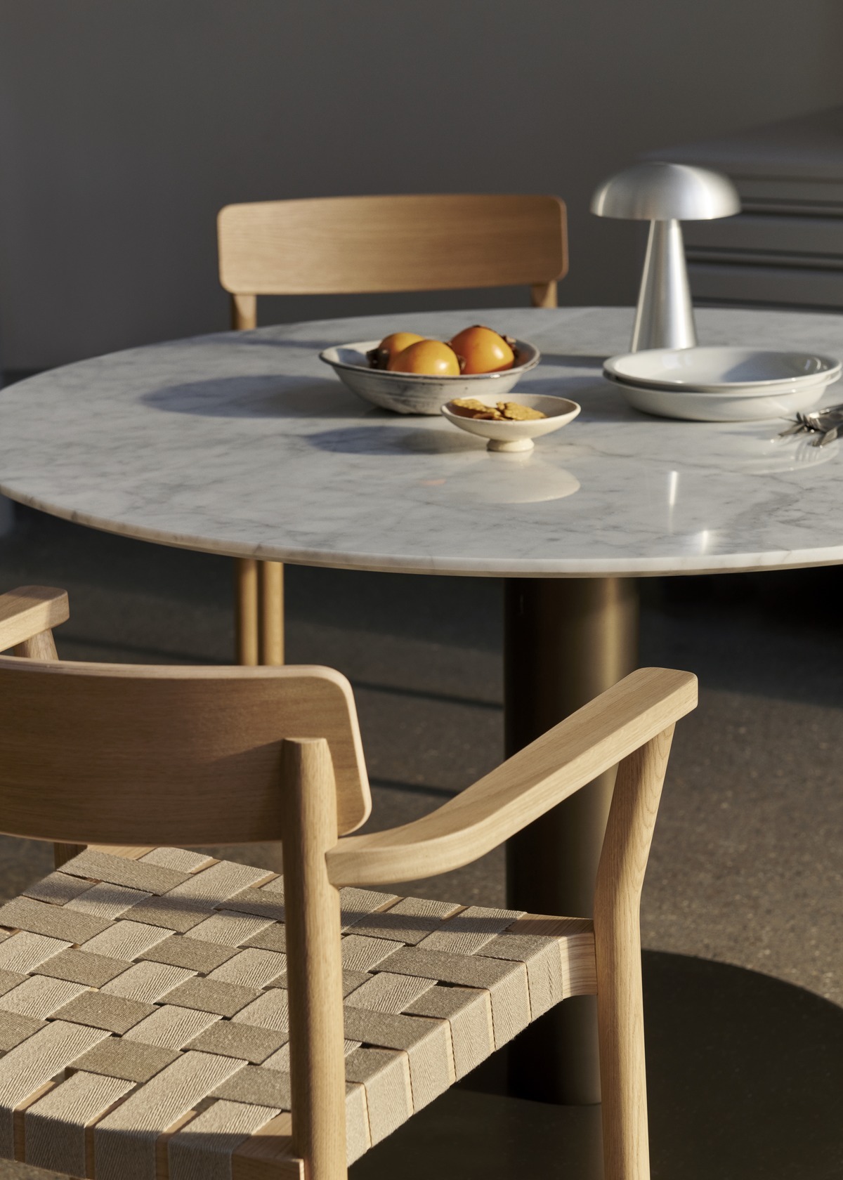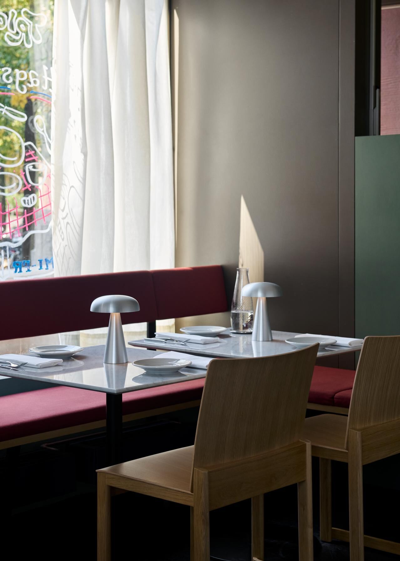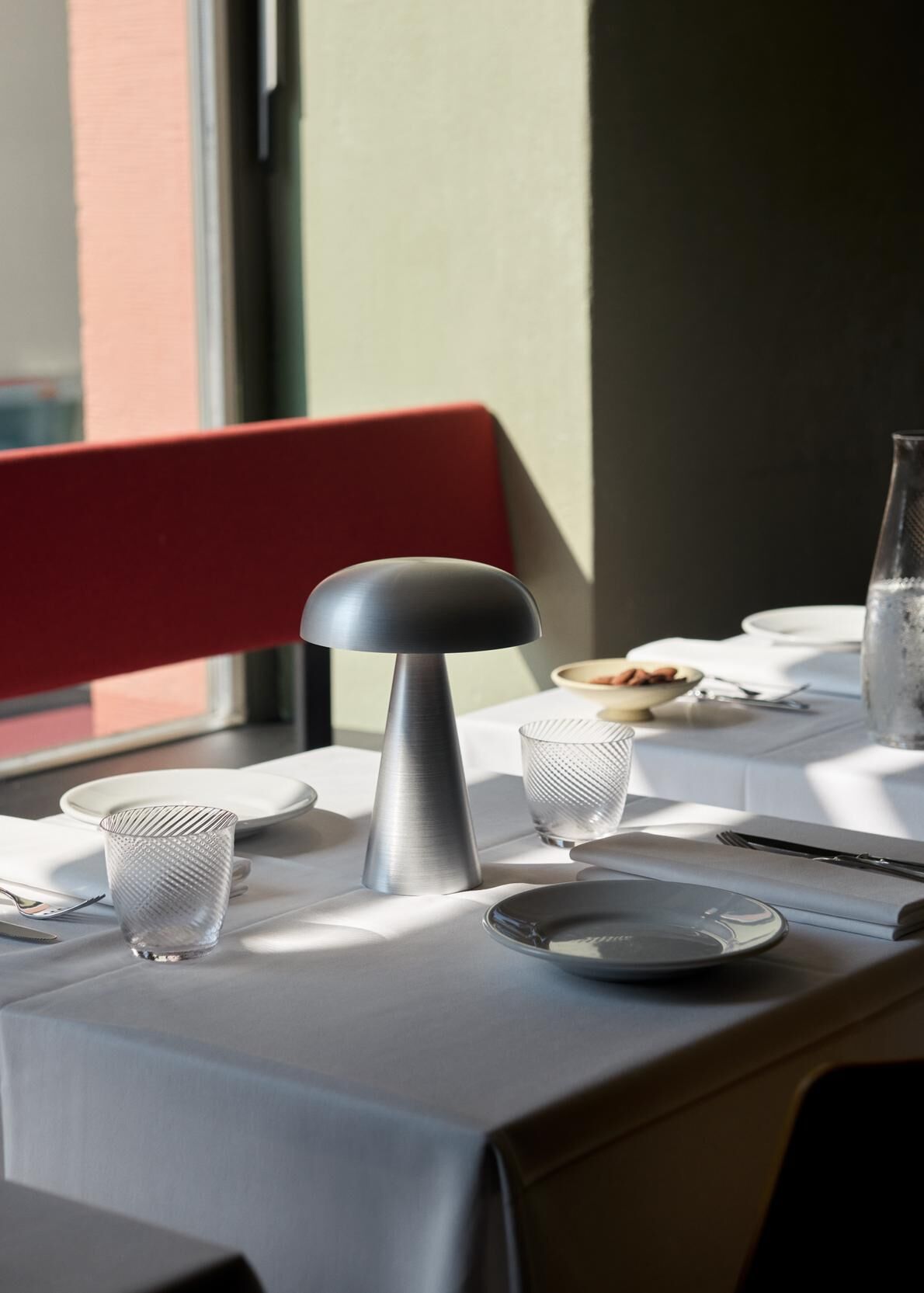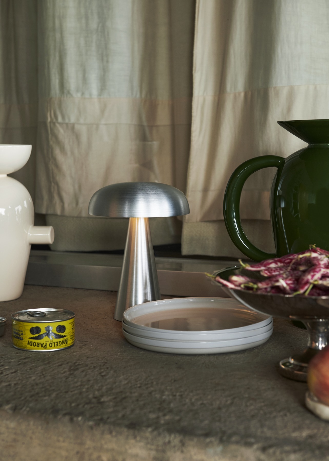 Como SC53 可攜式桌燈 以其對比鮮明的設計語彙展現獨特美感——穩固的底座由下而上漸收,延伸至柔和且富有有機曲線的燈罩,線條流暢且極具現代感。