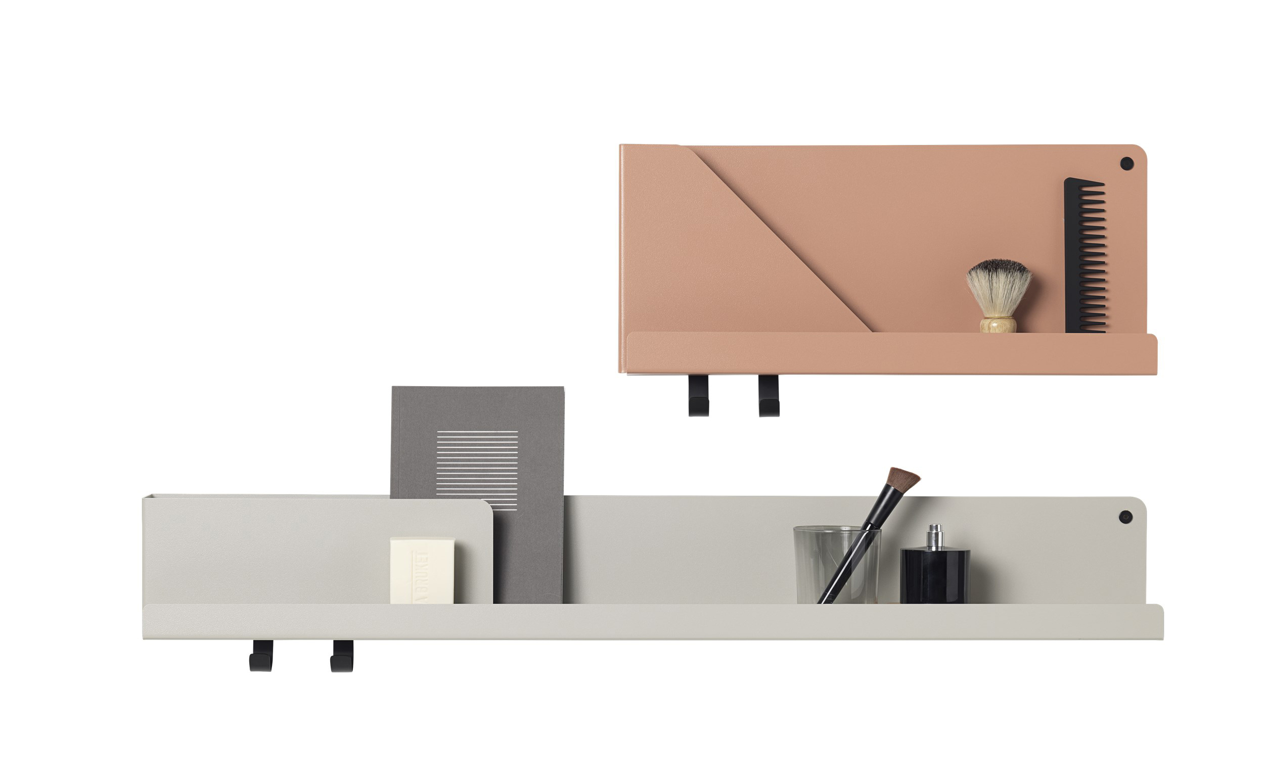 「山巒 」壁掛架 Folded 除了一般的儲物溝槽外,還有一個斜角或矩型的書檔,可以防止書本雜誌倒下;讓壁掛架也能擁有山巒般的層次美。另外還附有兩個掛鉤,可以同時吊掛包包或其他物品,一舉數得,將壁掛收納功能發揮淋漓盡致。