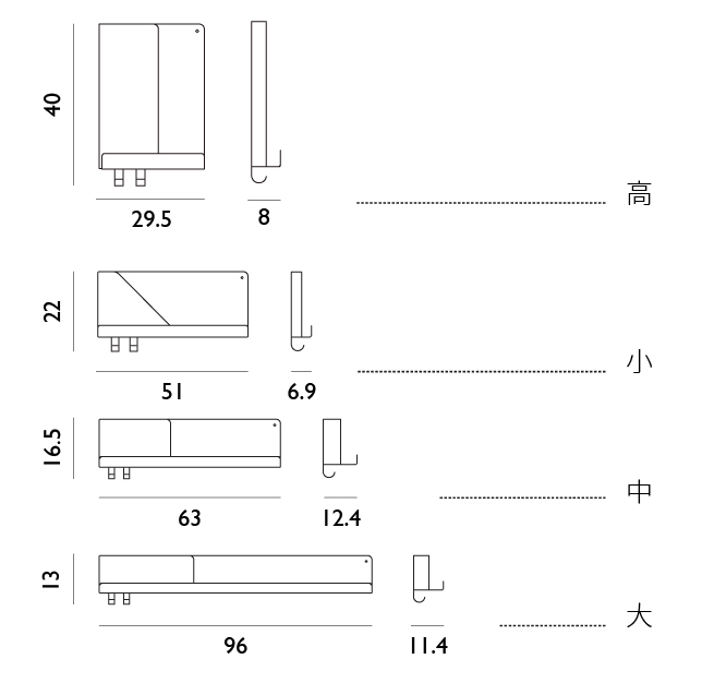 • 四個不同尺寸,可以依照功能與視覺美感交錯使用。