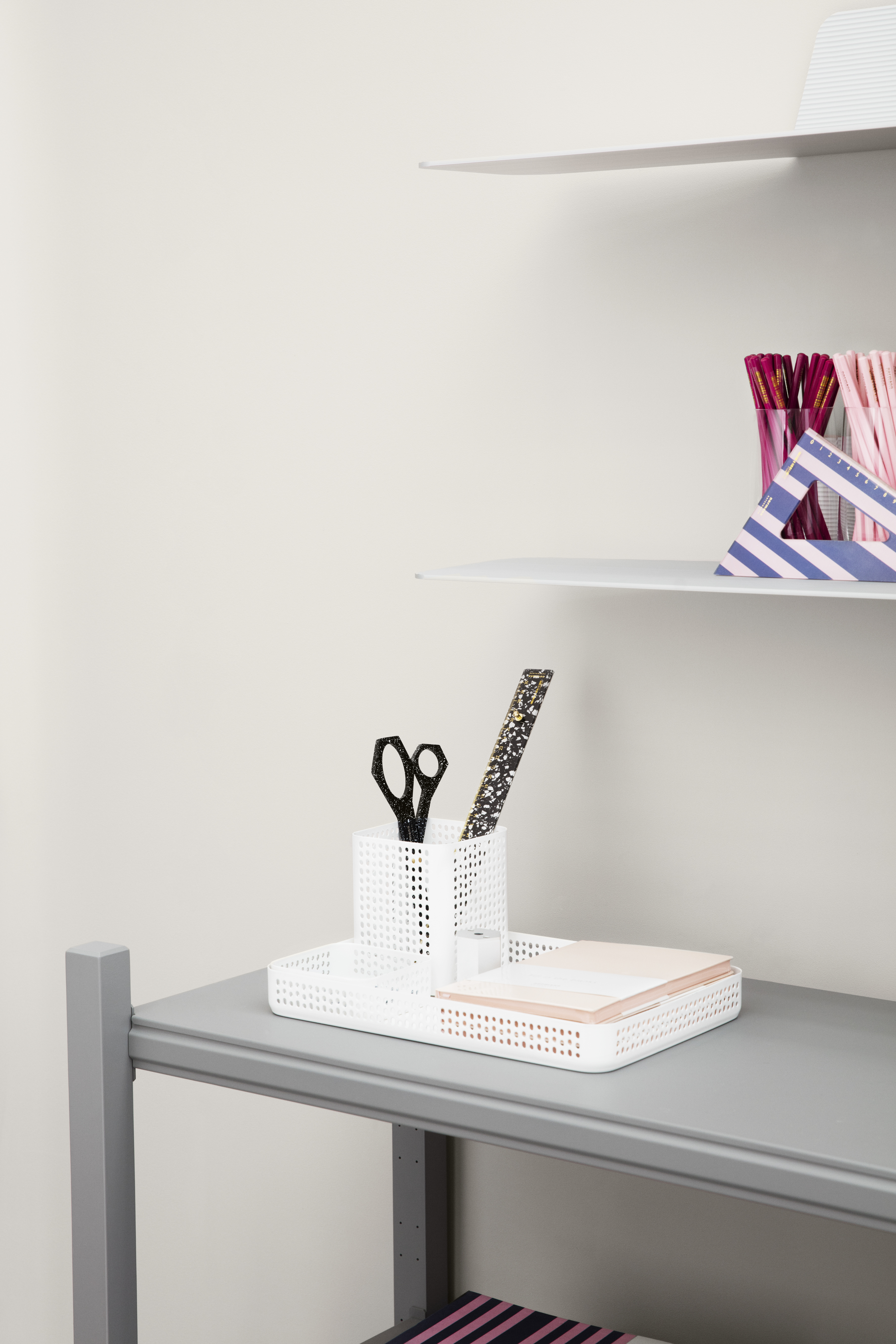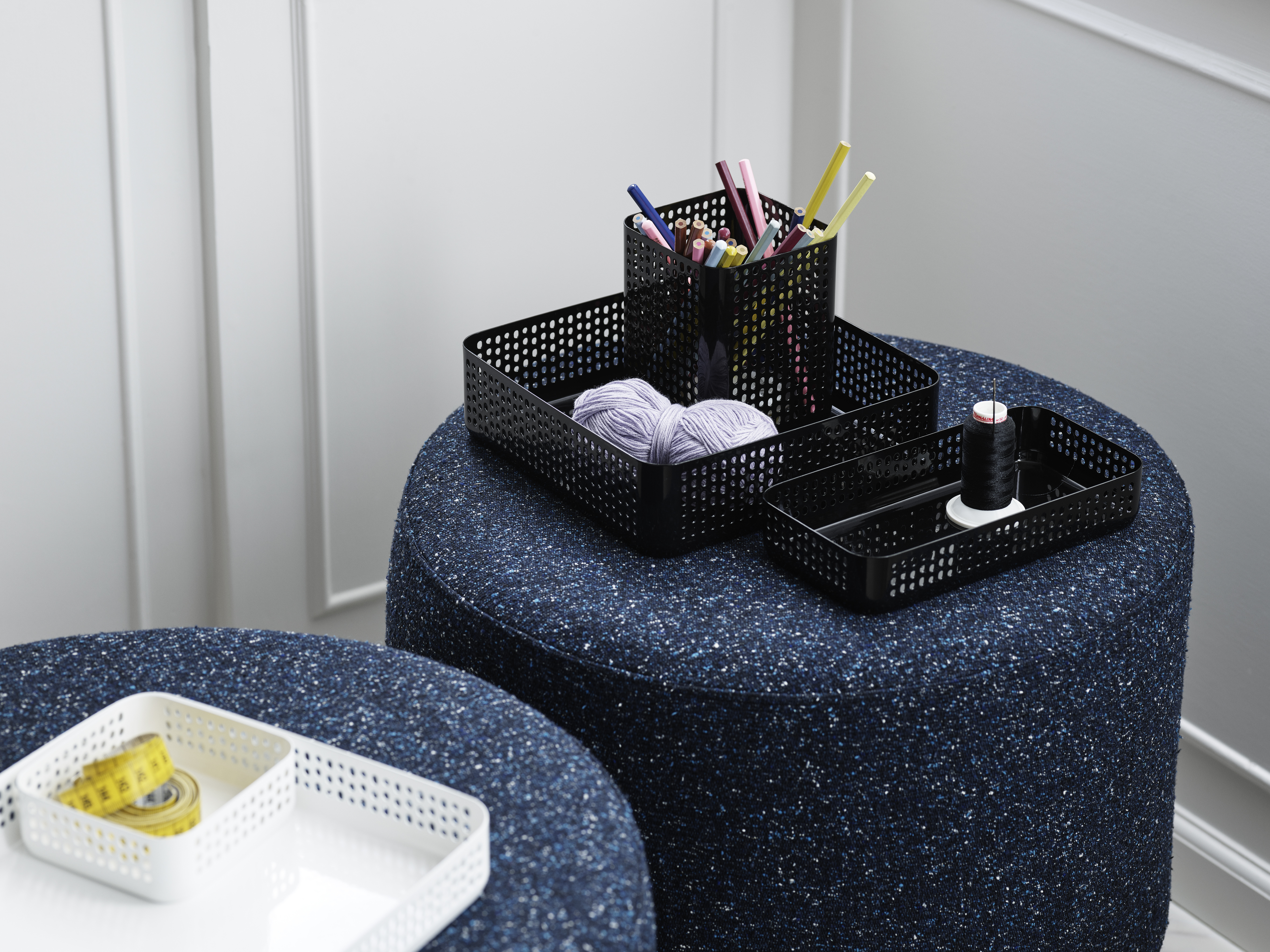 「洞察」收納組 "Nic Nac",讓人聯想到直觀、帶有工業風的俐落造型,一共有五種大小,可以互相套疊整理,讓桌面更加乾淨、收納更有彈性!四邊打洞的鏤空設計,使 Nic Nac 擁有工業質感,但精緻的收邊與亮面烤漆讓它在細節上更加引人入勝,成為實用又美觀的居家收納。