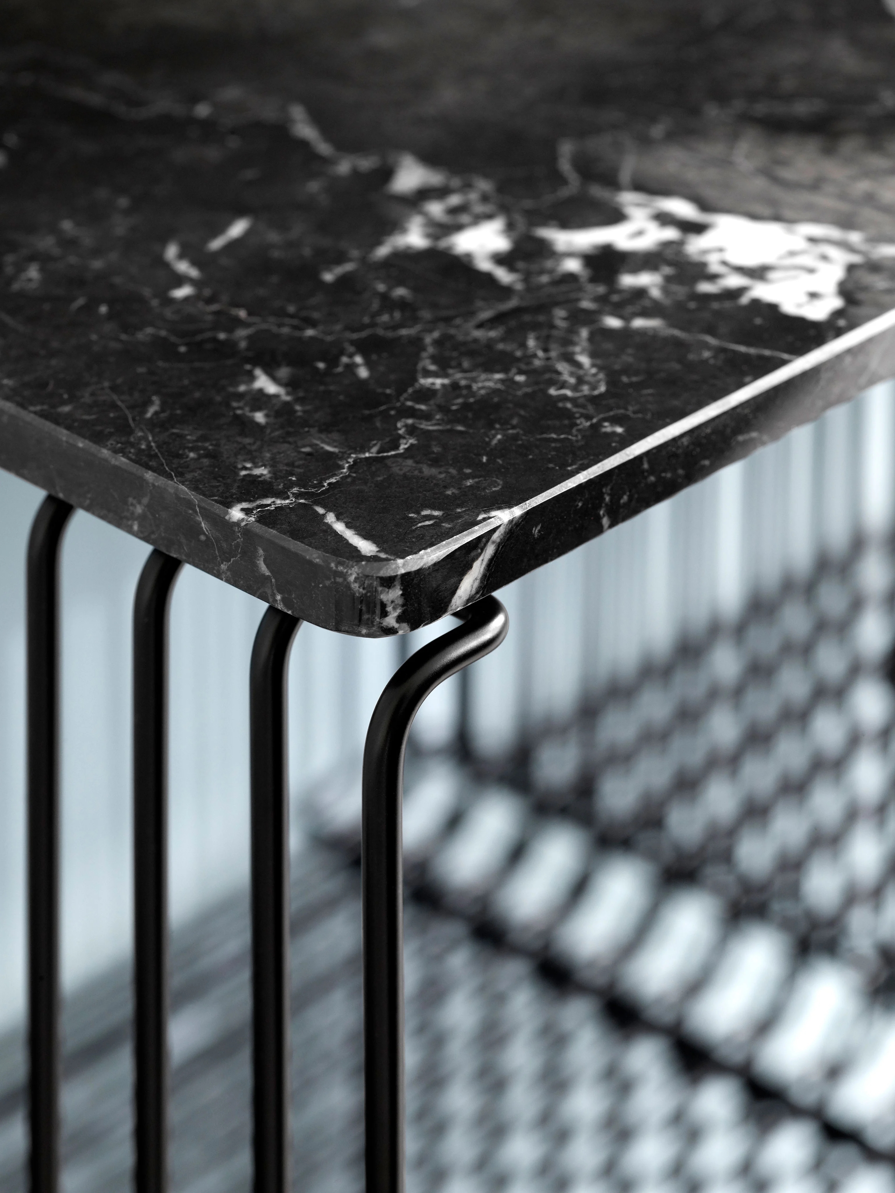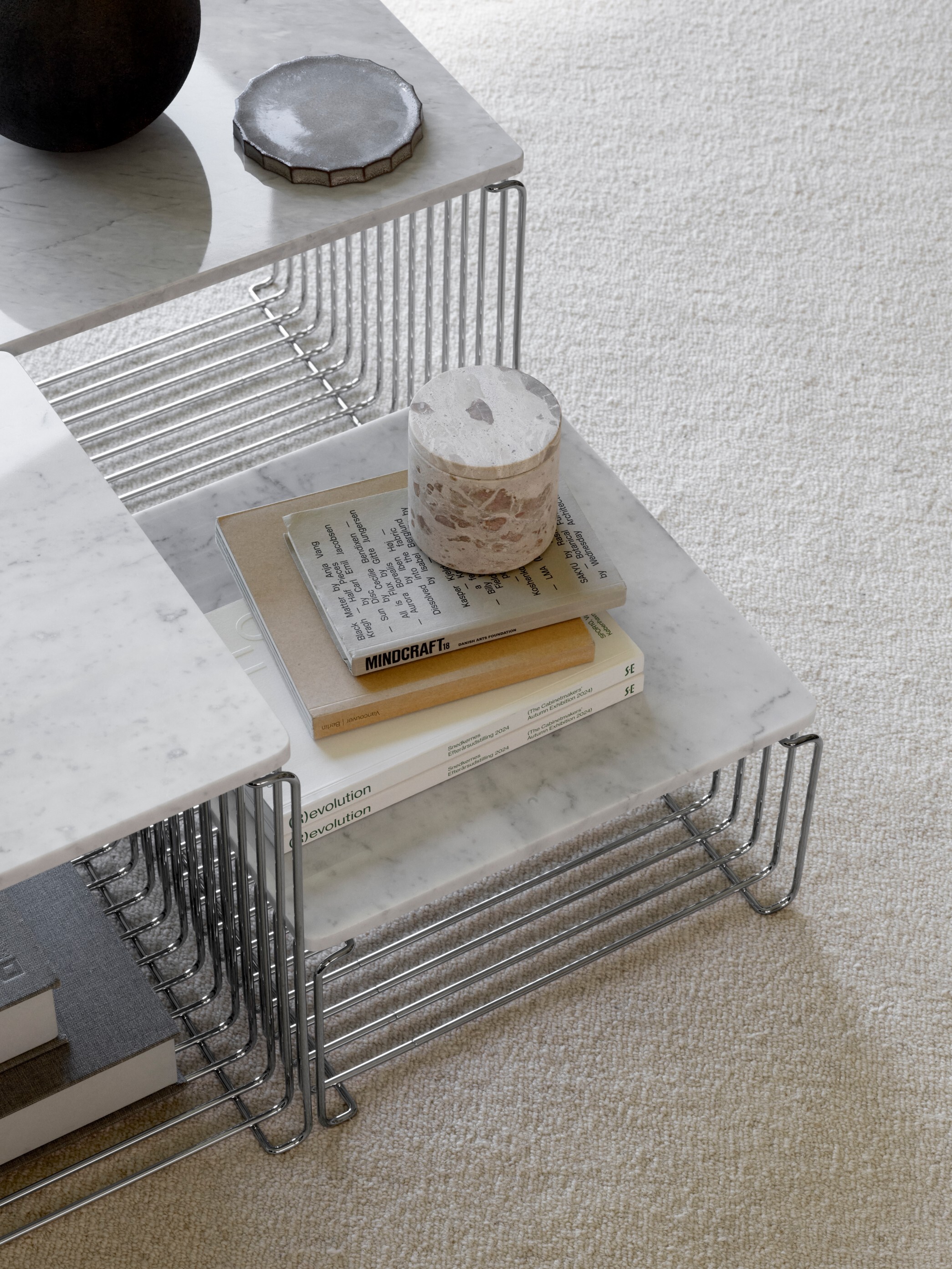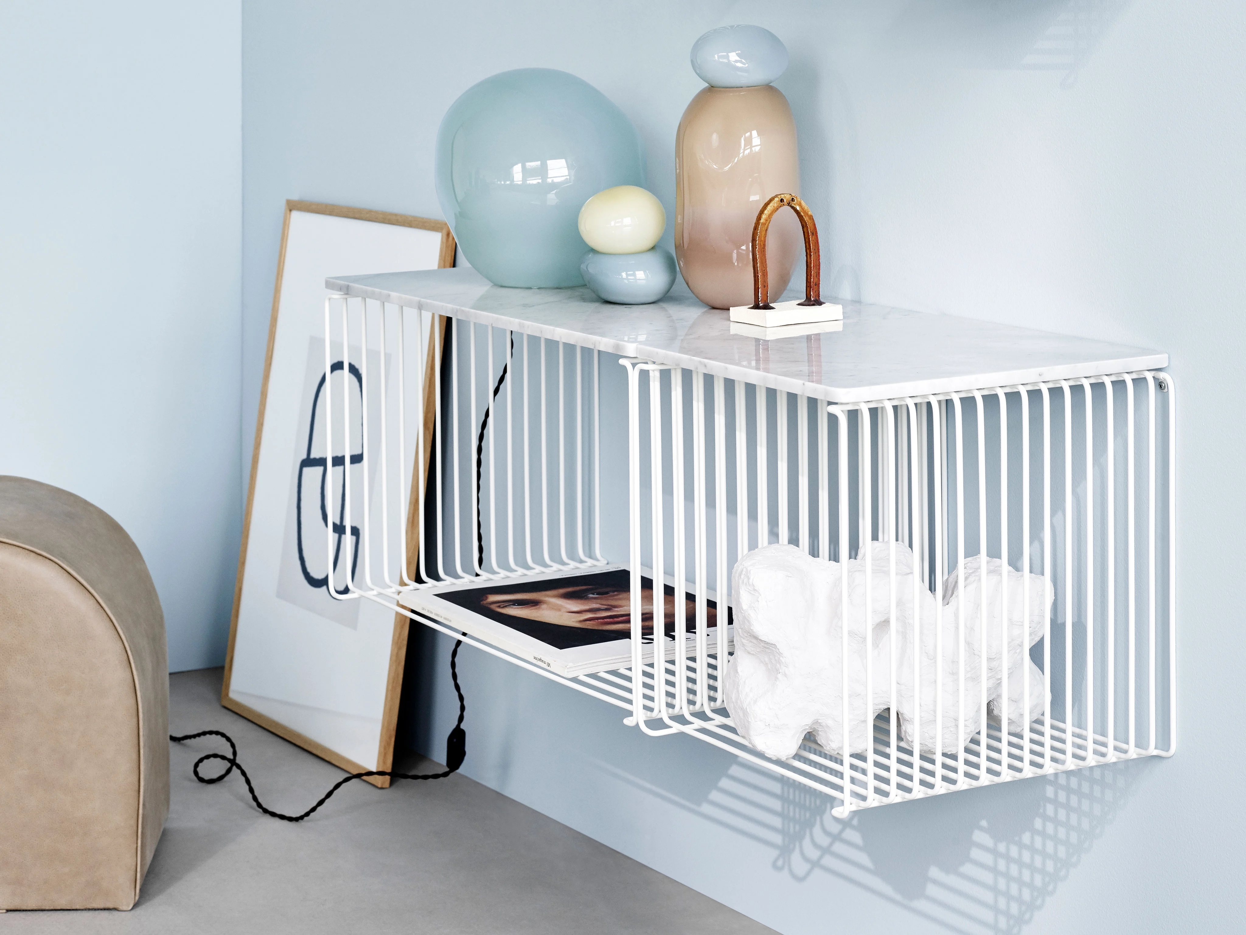 把單片桌板搭配 Panton Wire 迷網/多功能壁掛架,立刻多出一個平整檯面,讓層架輕鬆變身實用的小桌子。