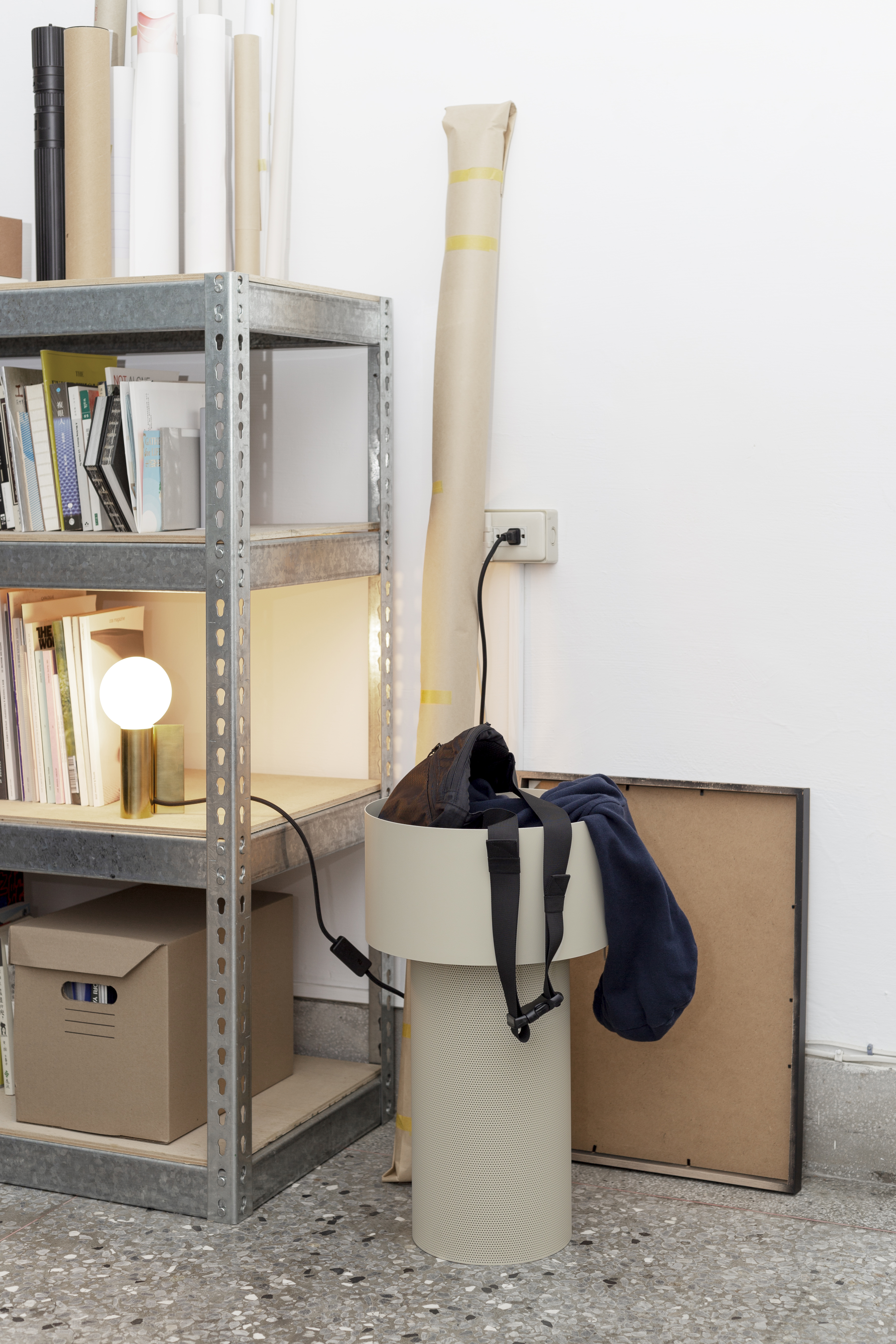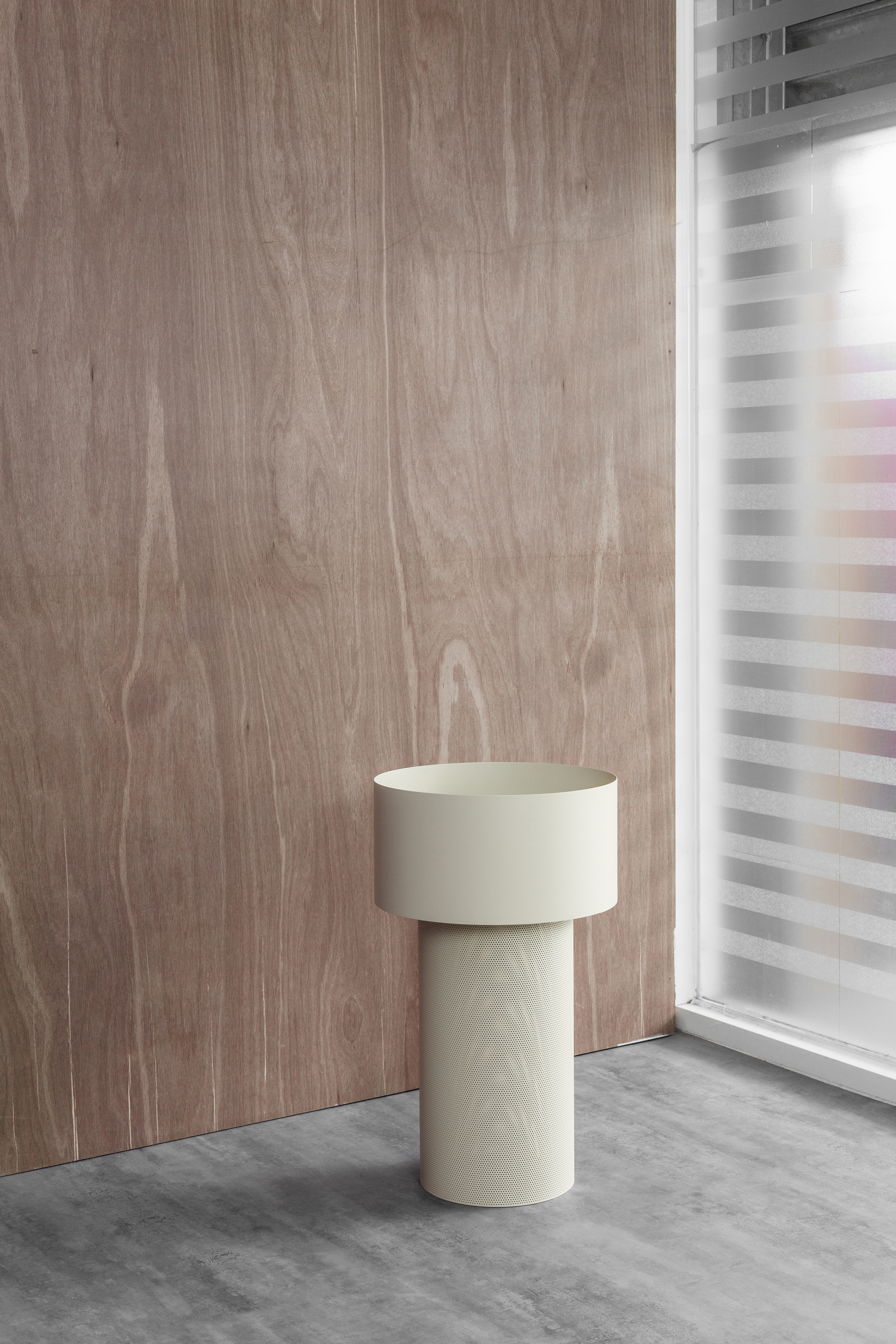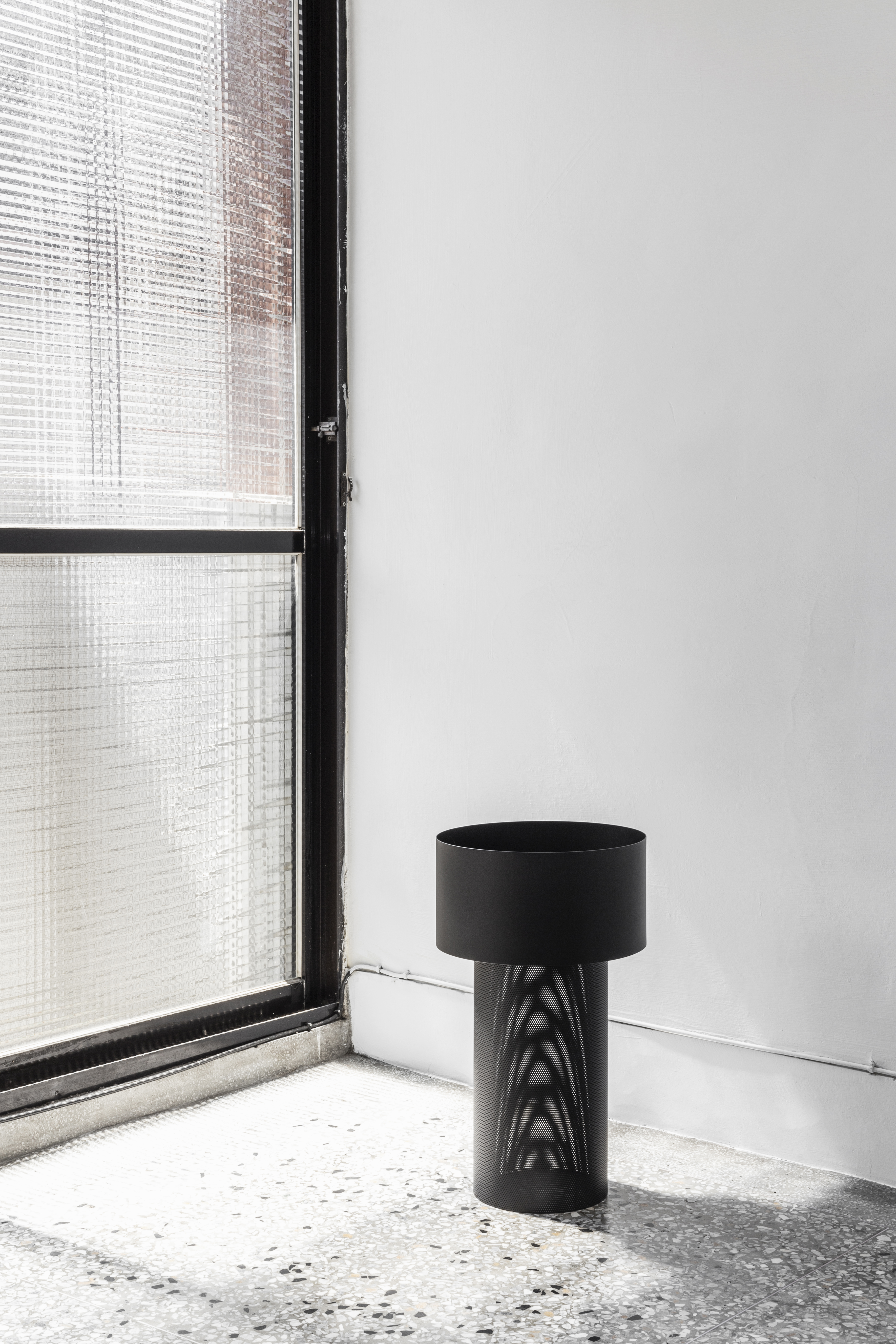 不同於大理石面的邊桌,「台柱」收納邊桌使用金屬圓柱的造型,讓 Pedestal 搖身一變,成為可以收納物件的實用邊几,同樣使用輕盈的沖孔網狀金屬桌腳,型構成不同層次的圓柱造型,兩種樣態金屬的相互映襯,成為一張極富現代感的收納設計。