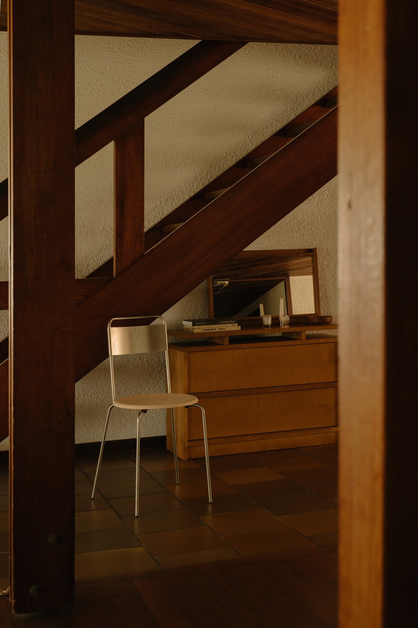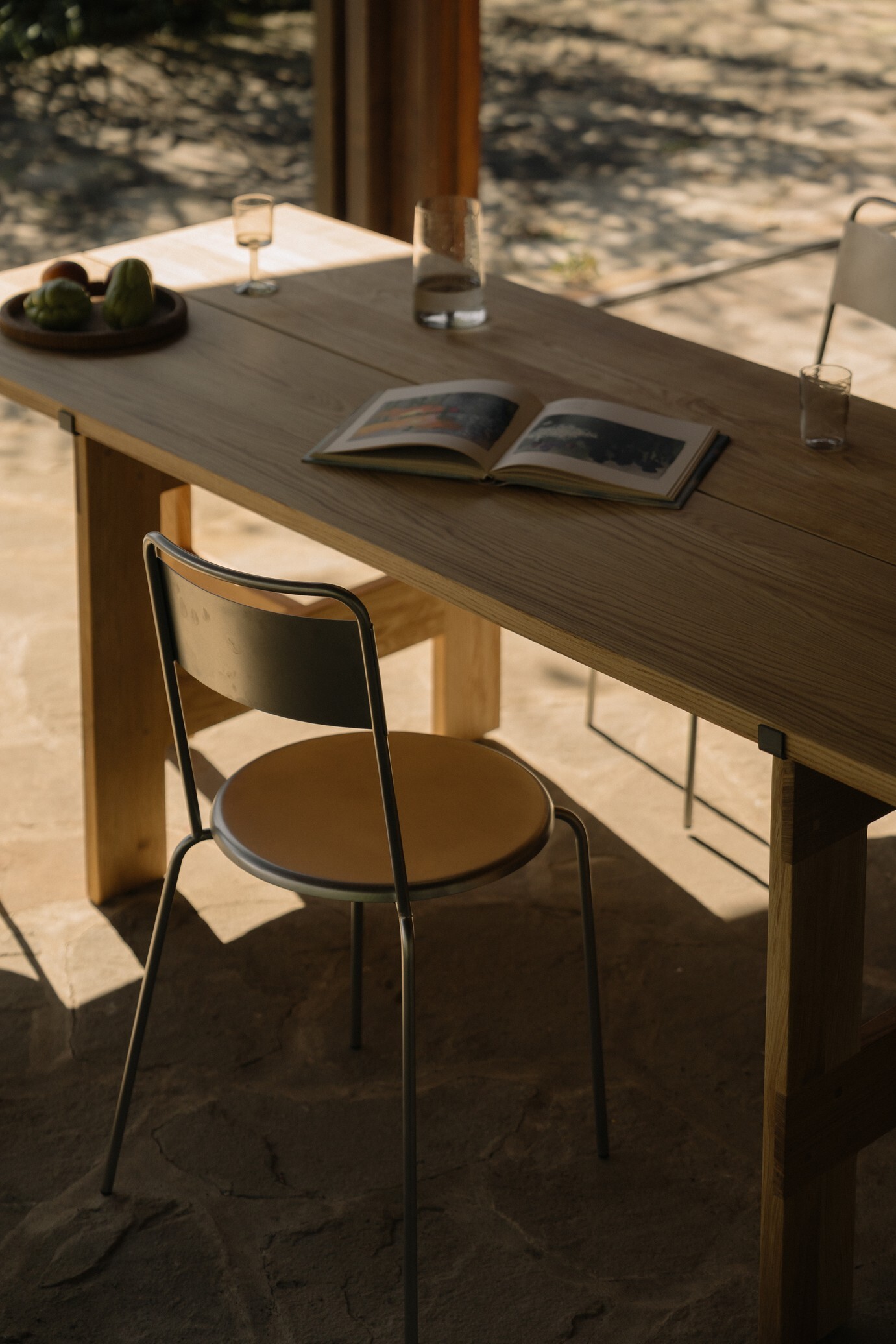這系列由建築師 Troels Grum-Schwensen 設計,首張椅誕生於丹麥 Møn 島的舊糖廠空間,以鋼椅的輕盈對比粗獷牆面,展現風格與功能的平衡,也開啟與 FRAMA 的合作。