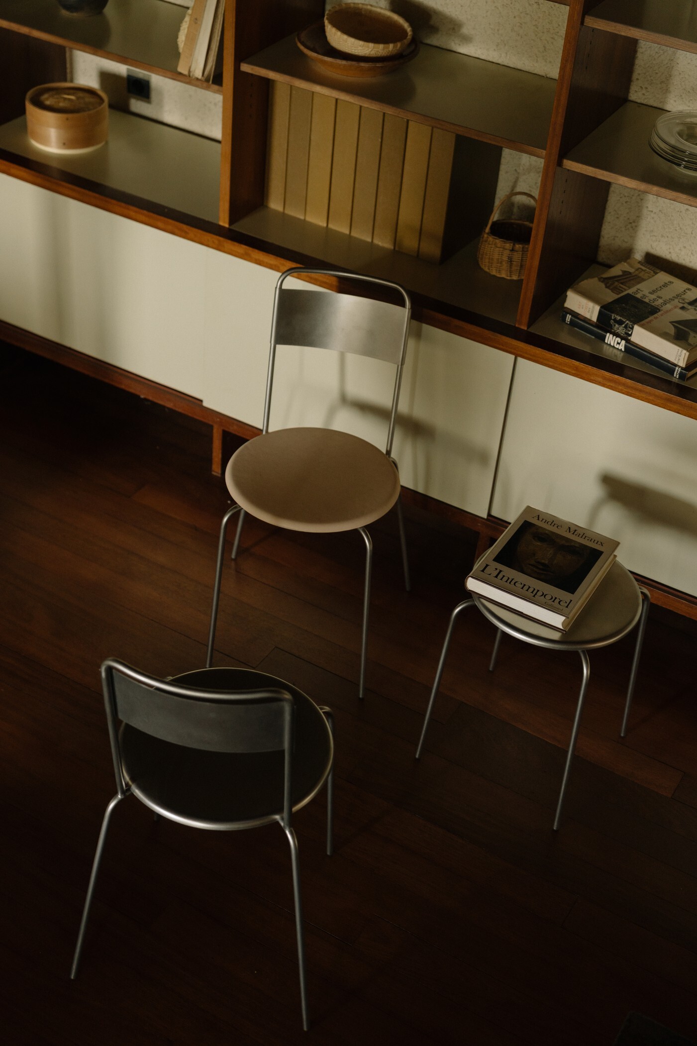 採用不銹鋼搭配天然皮革座面,表面帶有髮絲紋質感,保留材料本質的質地與觸感。