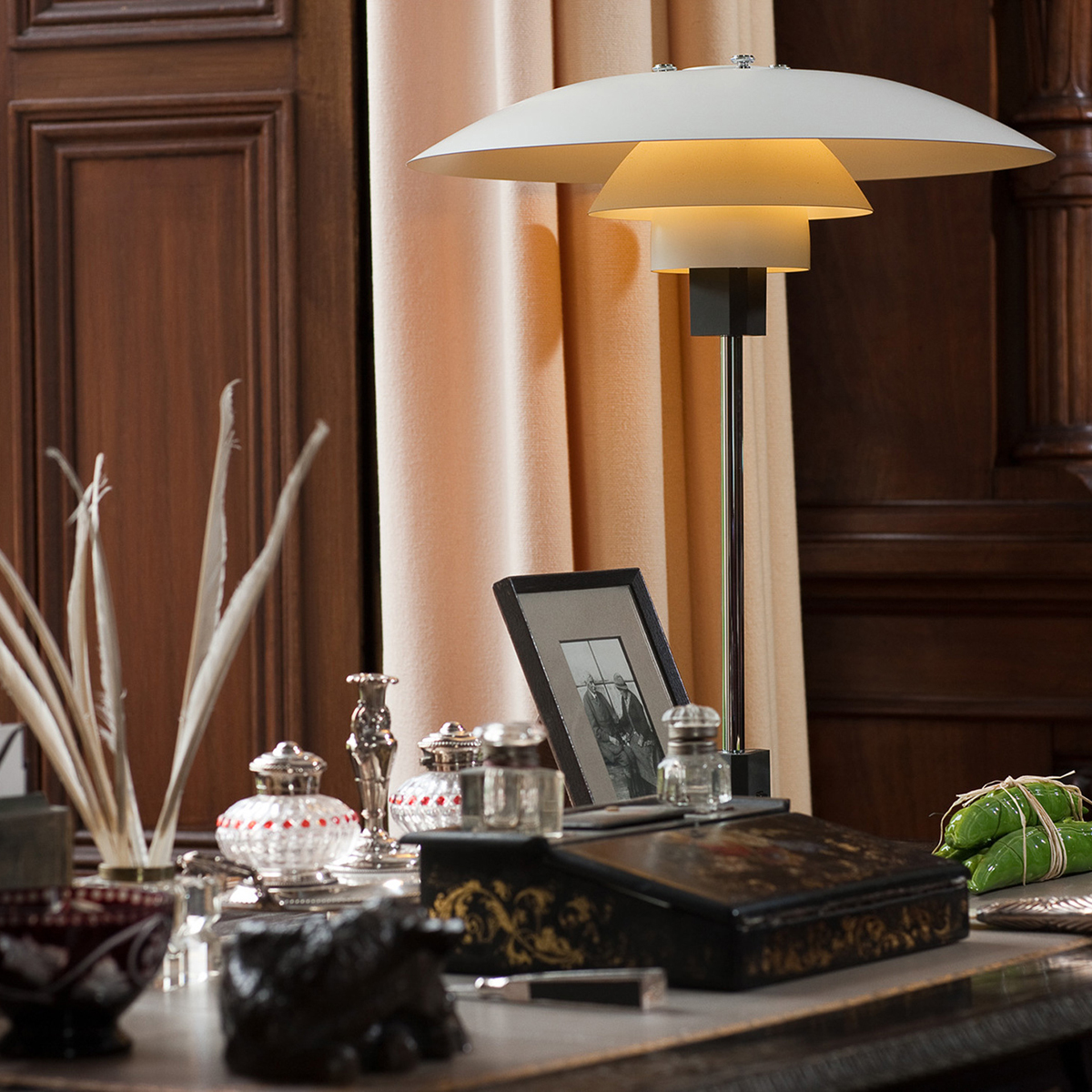 PH 燈具系列出自丹麥燈具設計大師  Poul Henningsen 的經典設計,透過層疊的燈罩巧妙的將燈泡包覆,不僅不會直射眼睛,更透過多重光源反射、產生不炫光、柔和的光芒。