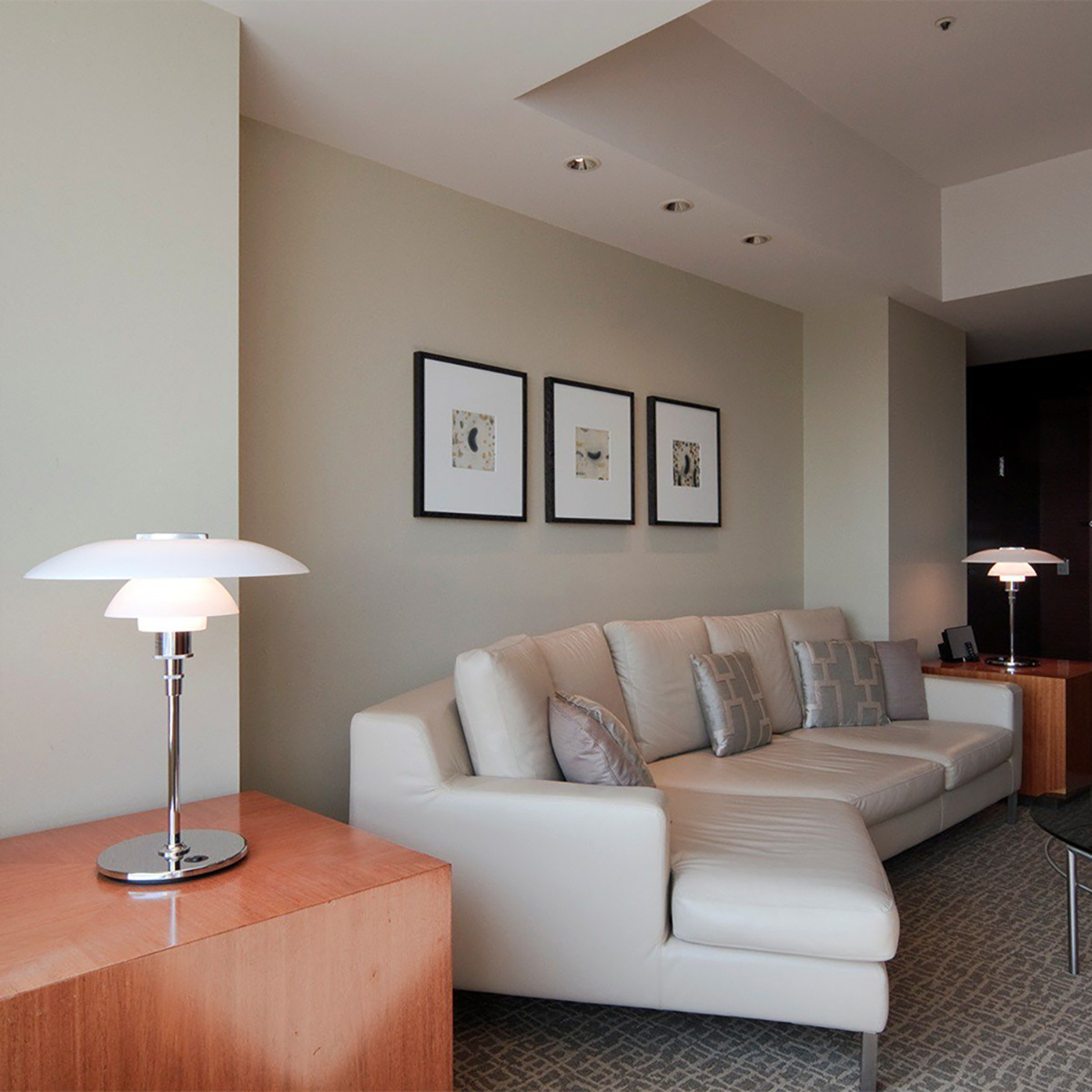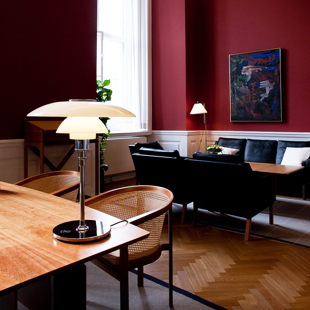 玻璃燈罩材質使光線更加柔和,光線透過滑順的燈罩曲線展示出 PH 燈的輪廓,但不減少其明亮度;金屬燈桿帶來俐落的現代感,增添高貴優雅的氛圍。