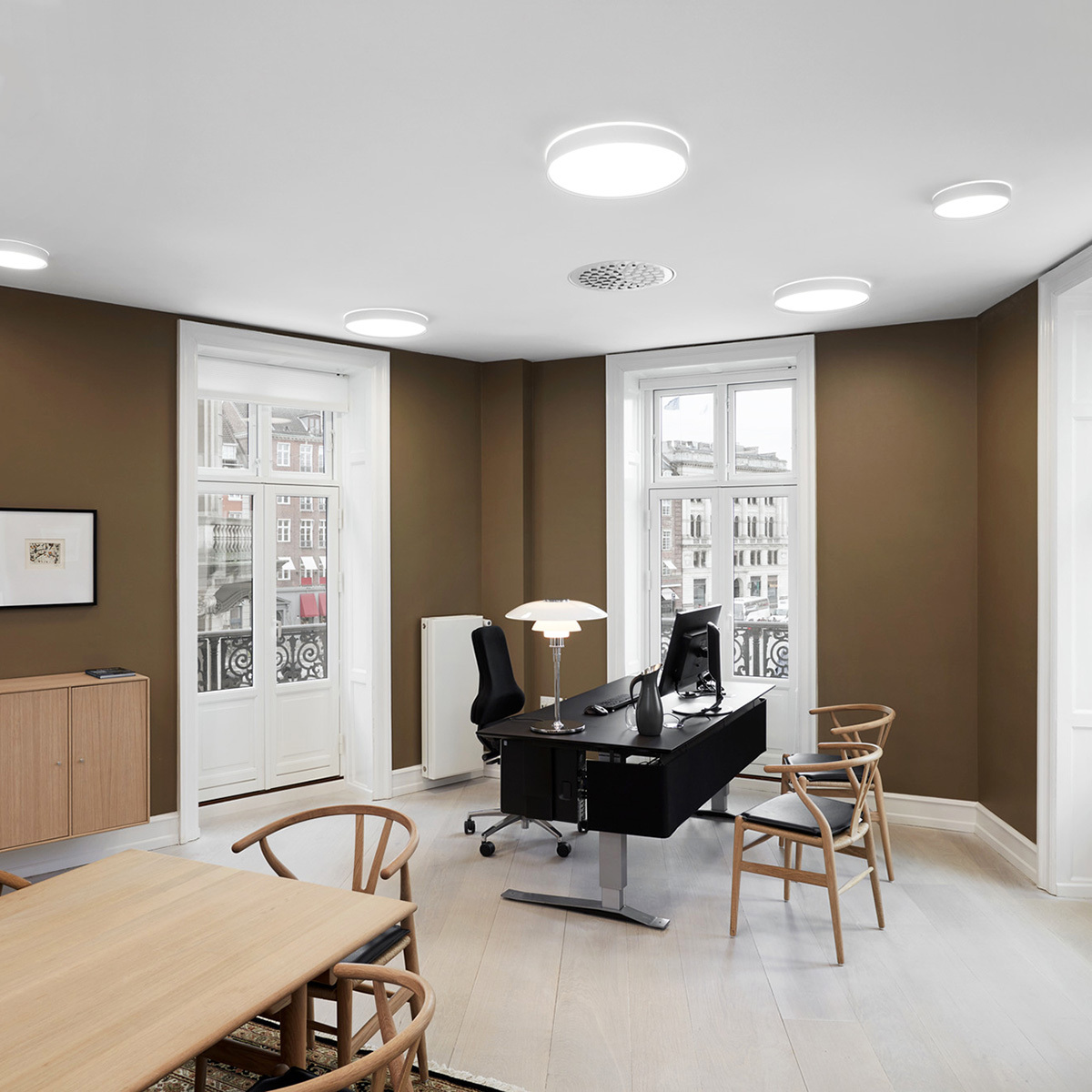 PH 燈具系列出自丹麥燈具設計大師  Poul Henningsen 的經典設計,透過層疊的燈罩巧妙的將燈泡包覆,不僅不會直射眼睛,更透過多重光源反射、產生不炫光、柔和的光芒。