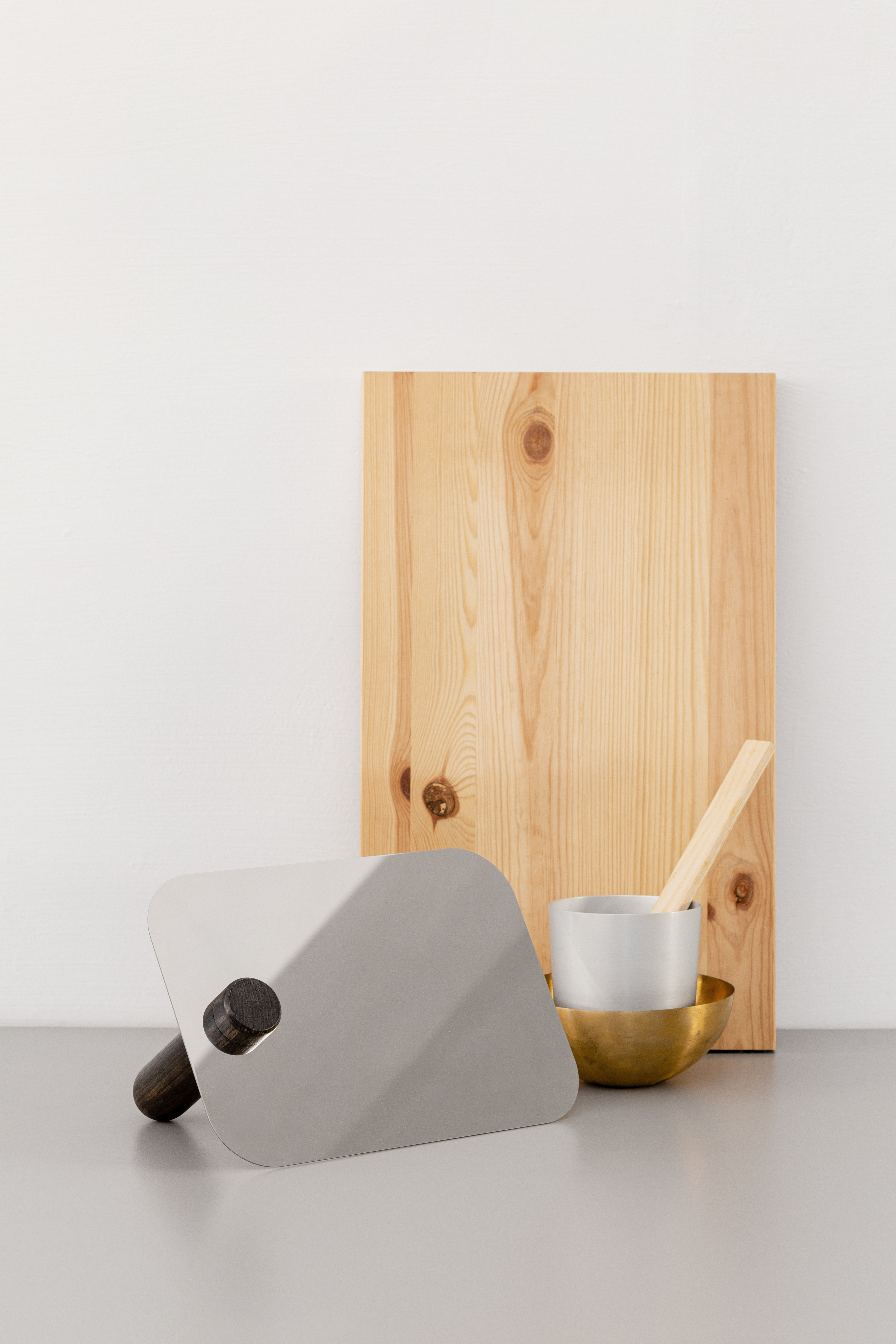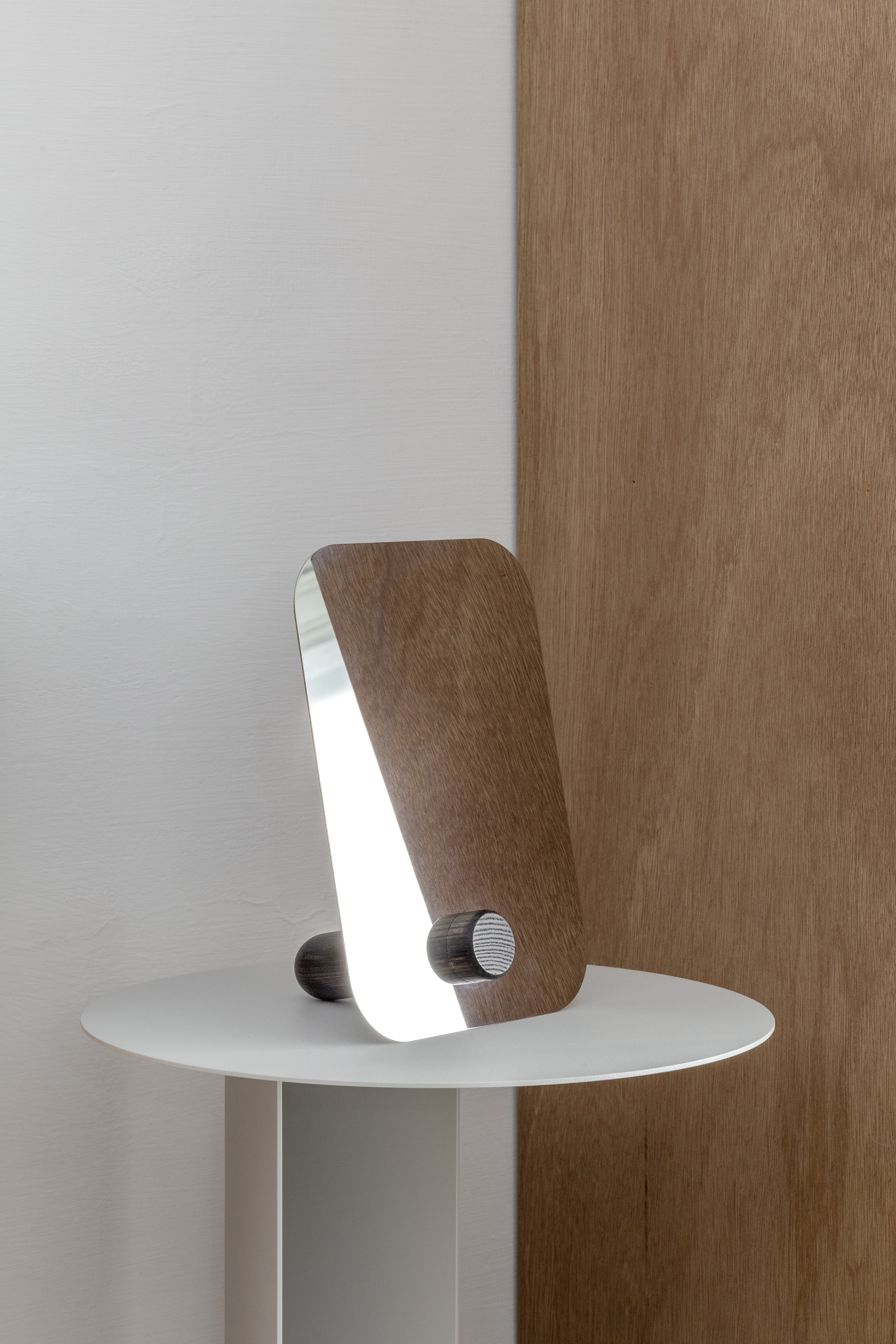 Pinokio 桌鏡是以拋光不鏽鋼鏡面與木質支撐所構成的極簡概念,可以直式或橫式隨意放置,兩種不同的角度。內附一片棉布方便擦拭。