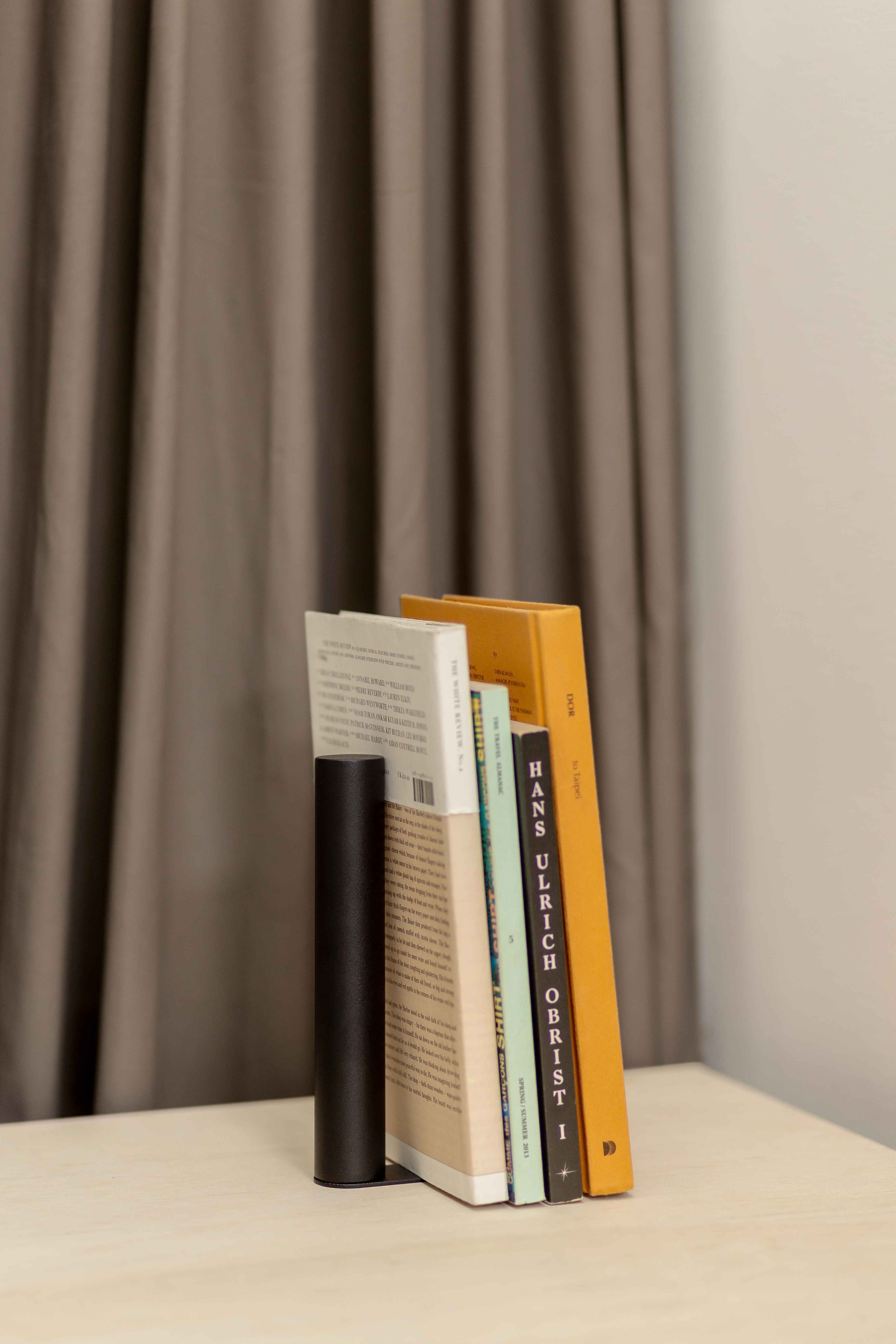 由兩個幾何體,圓柱與圓弧鐵片所組成,只用一個螺絲便能輕鬆組裝。以不顯眼卻又有趣的方式來融入生活,也是書桌或書架上整理書籍紙張的好幫手!