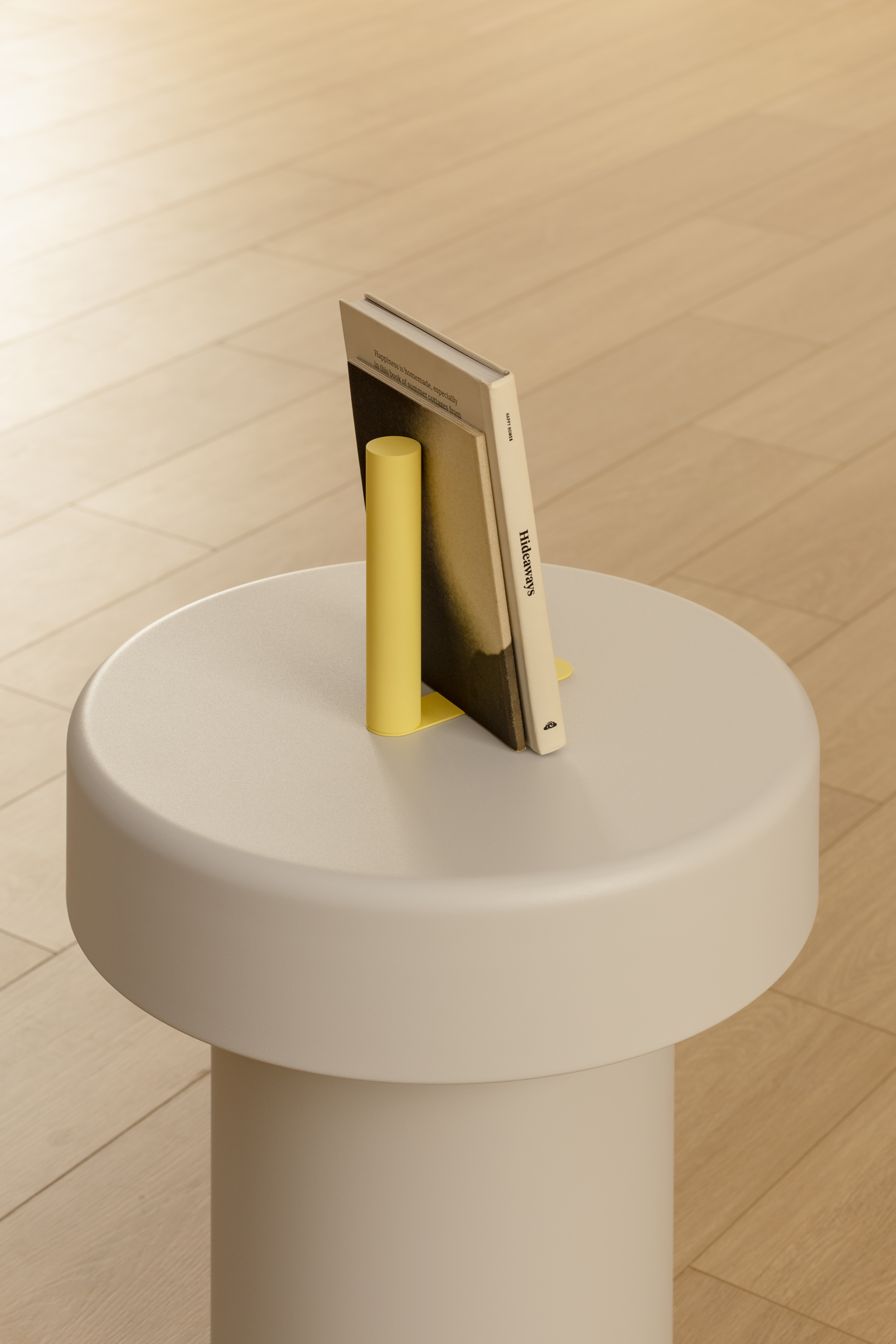 由兩個幾何體,圓柱與圓弧鐵片所組成,只用一個螺絲便能輕鬆組裝。以不顯眼卻又有趣的方式來融入生活,也是書桌或書架上整理書籍紙張的好幫手!