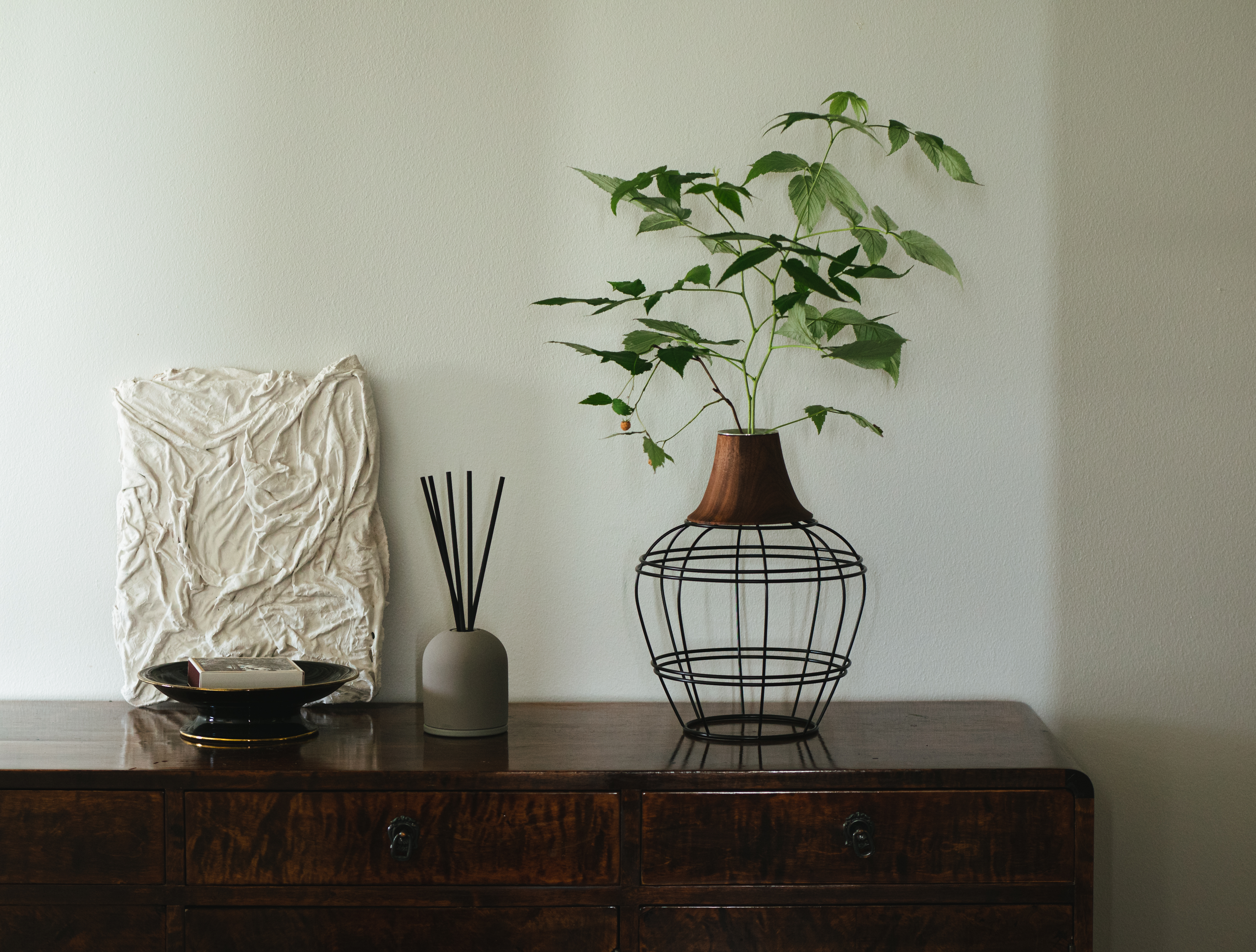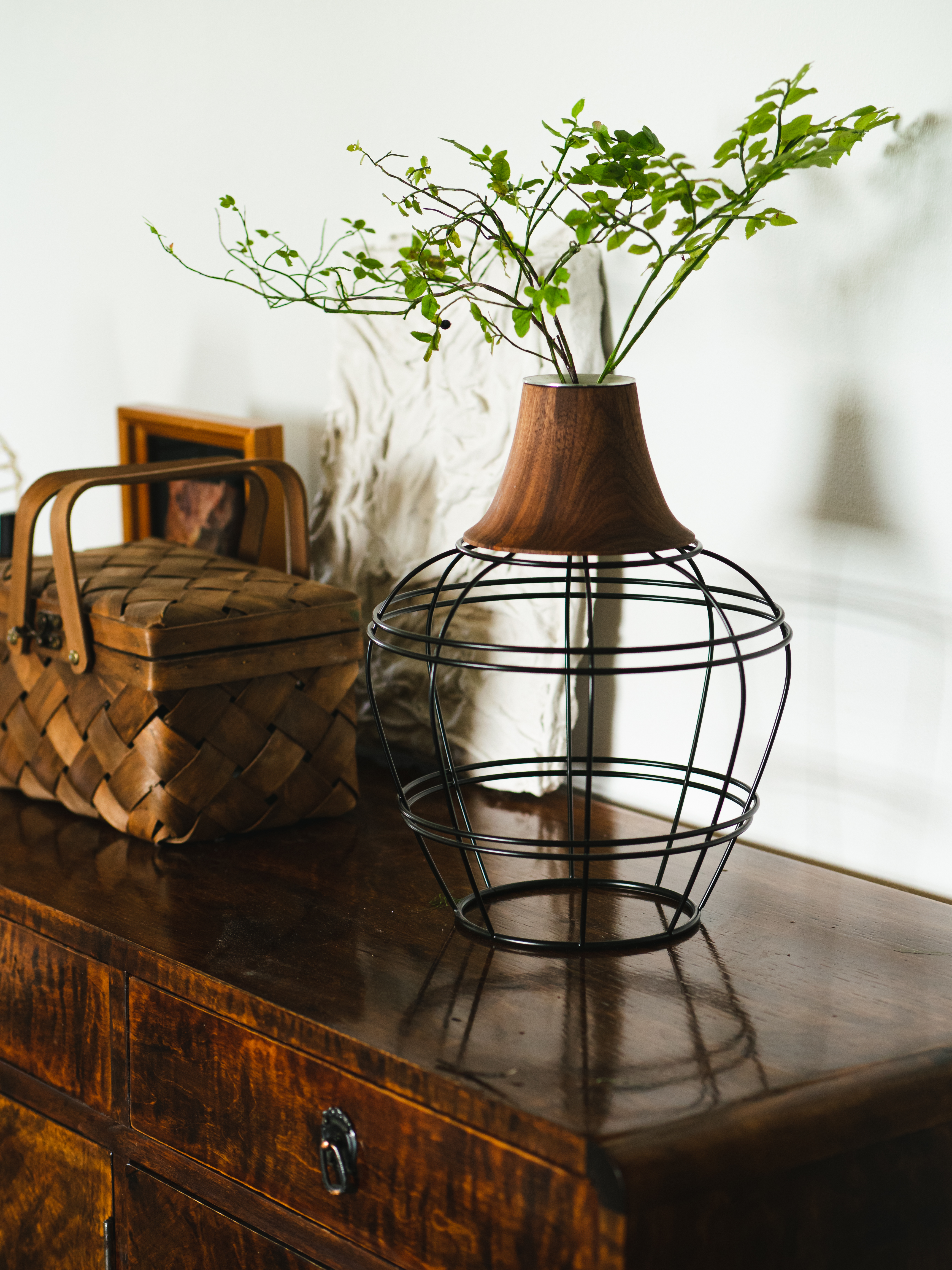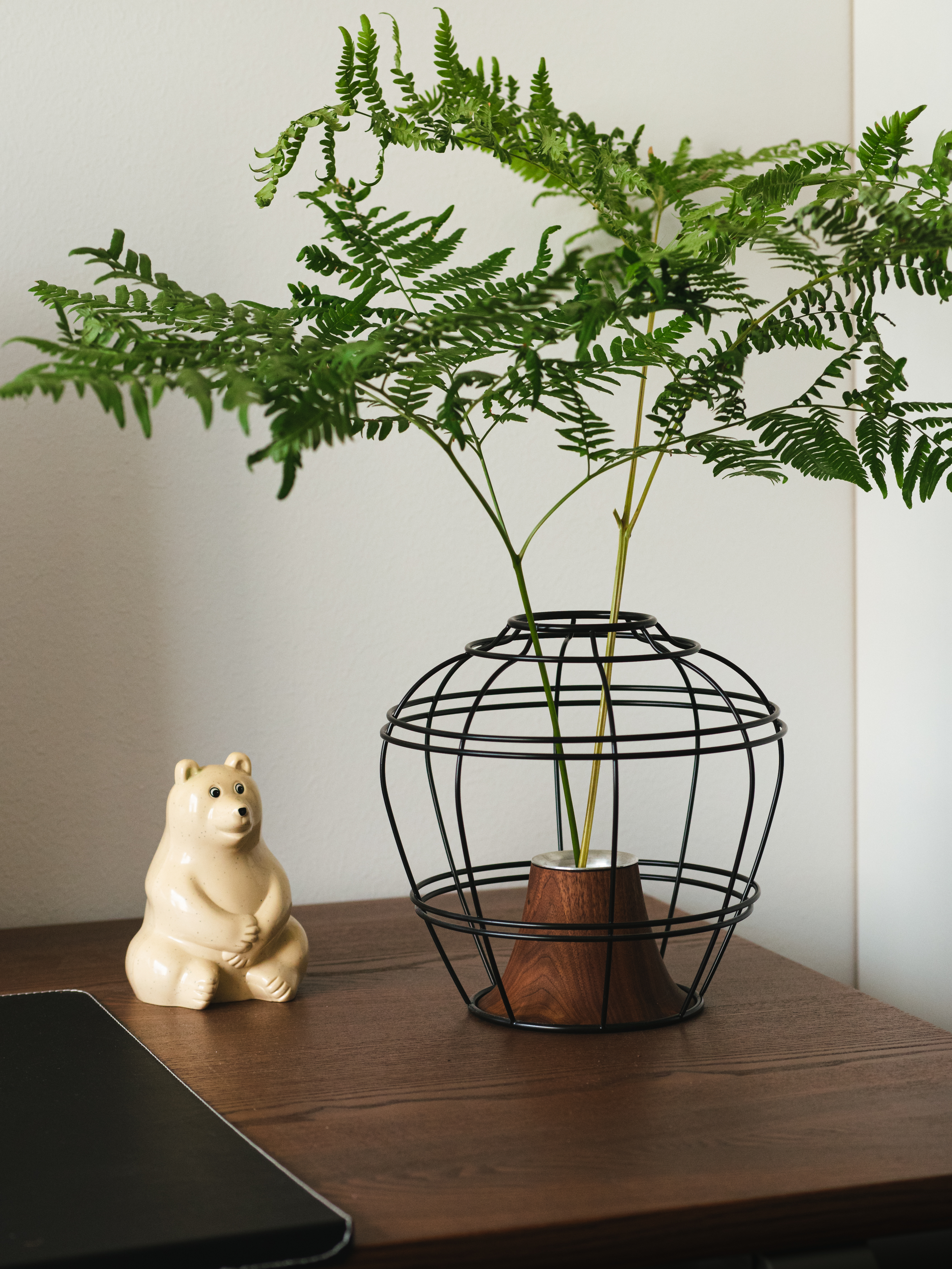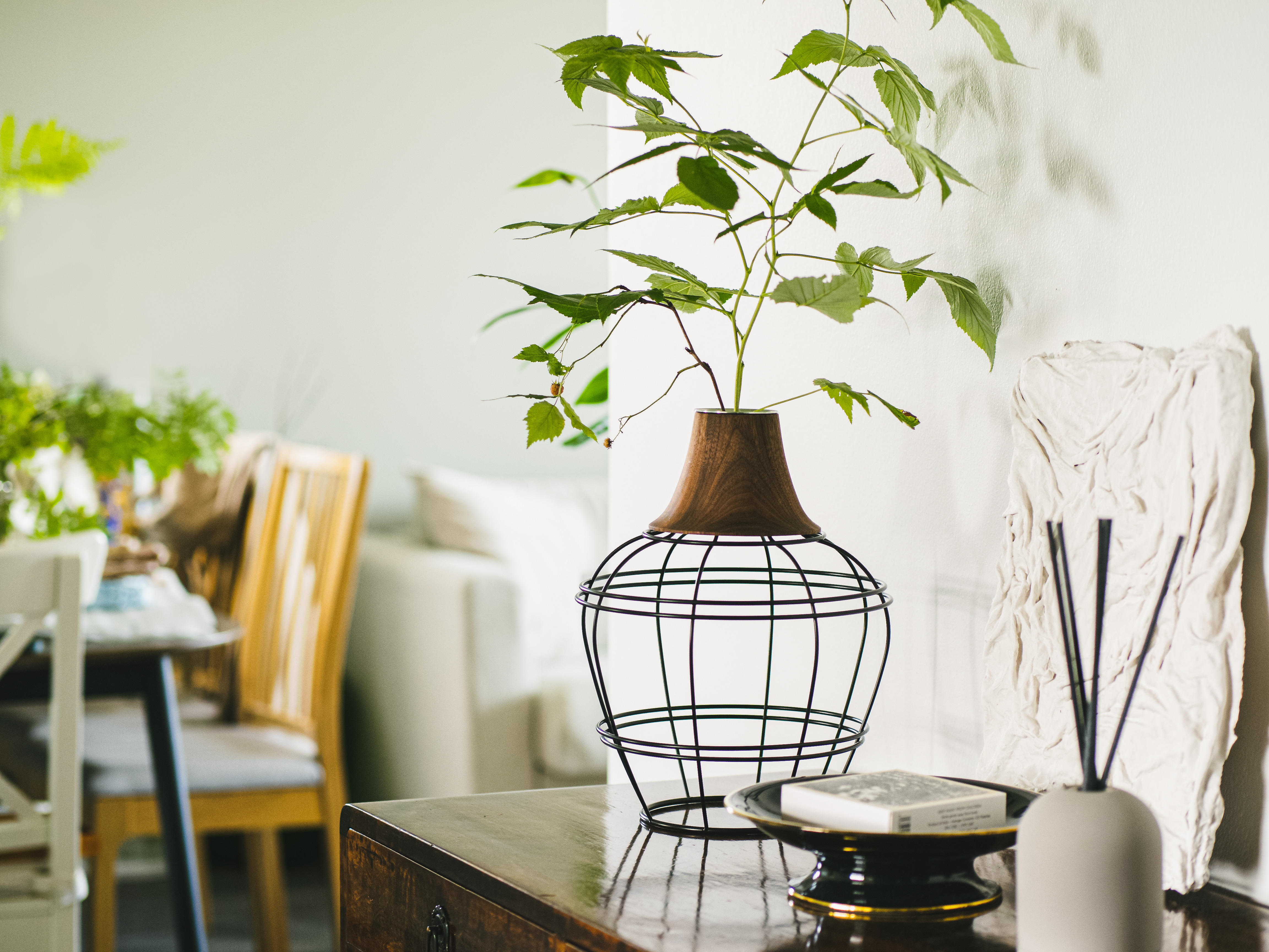 設計概念來自中國傳統的「梅瓶」,保留窄口、寬瓶身的傳統曲線,剩下的都由金屬線條完成。花器的框架線條,讓花材因而有支撐,連拙手都可以讓花聽命。360 度無死角,內與外的虛與實空間變化感,打破了插花的種種限制,延伸你閱讀花器,觀看植物的樣子。