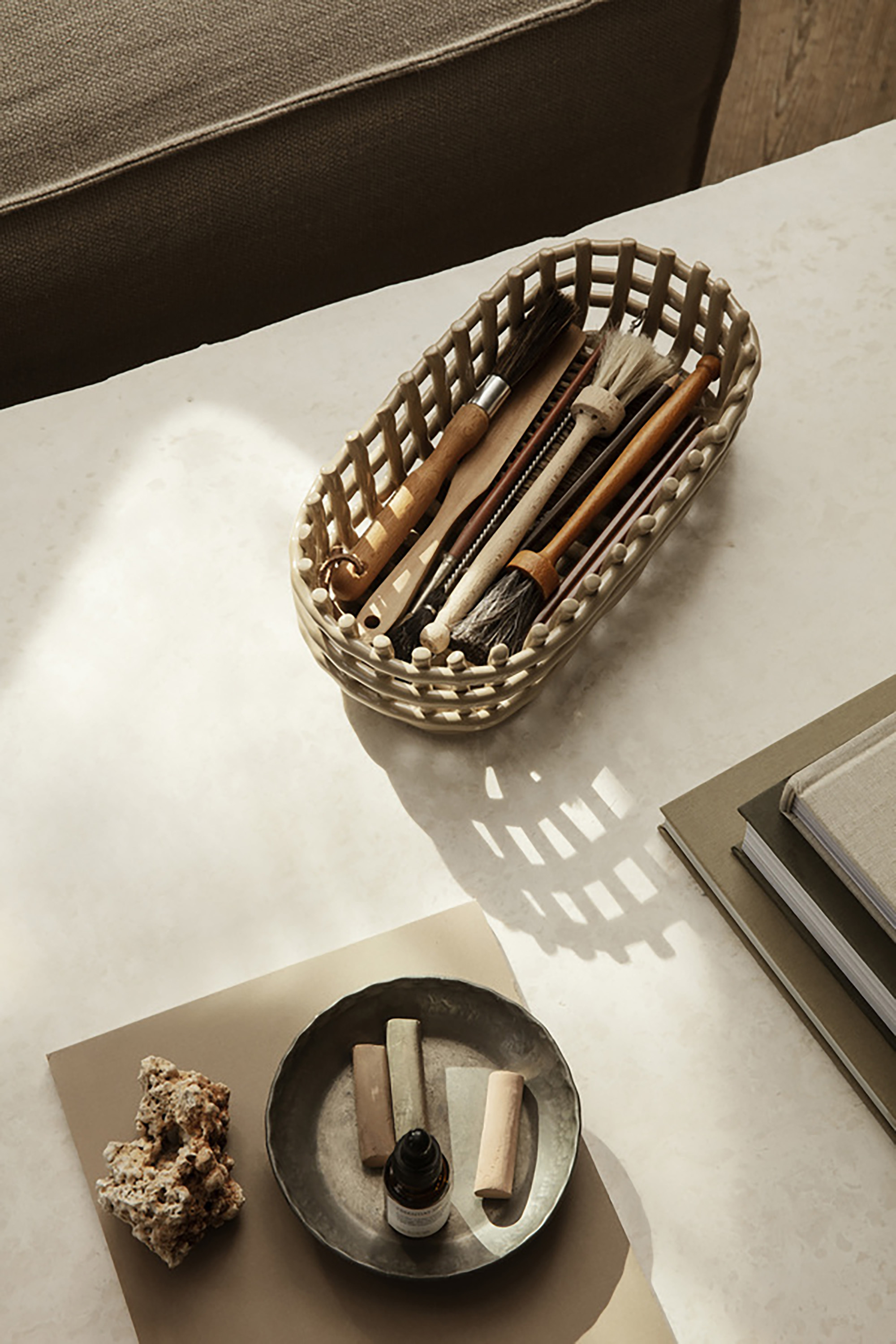 有別於以往的金屬材質,以精緻陶瓷結合編織工藝誕生而成的「粗網」置物籃 Ceramic Basket,能夠妥善收納所有生活物品,創造與眾不同的居家風格。手工製作的獨特線條,賦予每款商品外型都擁有不一樣的迷人印記,帶來輕盈的流動感。